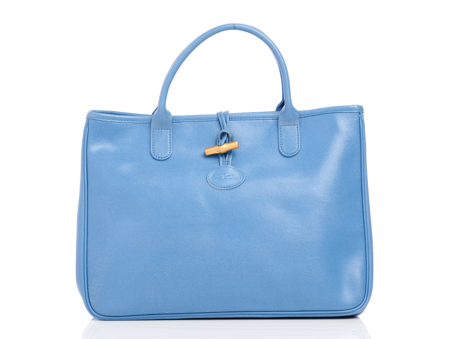 LONGCHAMP, A HANDBAG STYLED IN SKY BLUE LEATHER WITH FABRIC LINING AND GOLD TONE METAL HARDWARE, 24.5 X 34 X 11CM