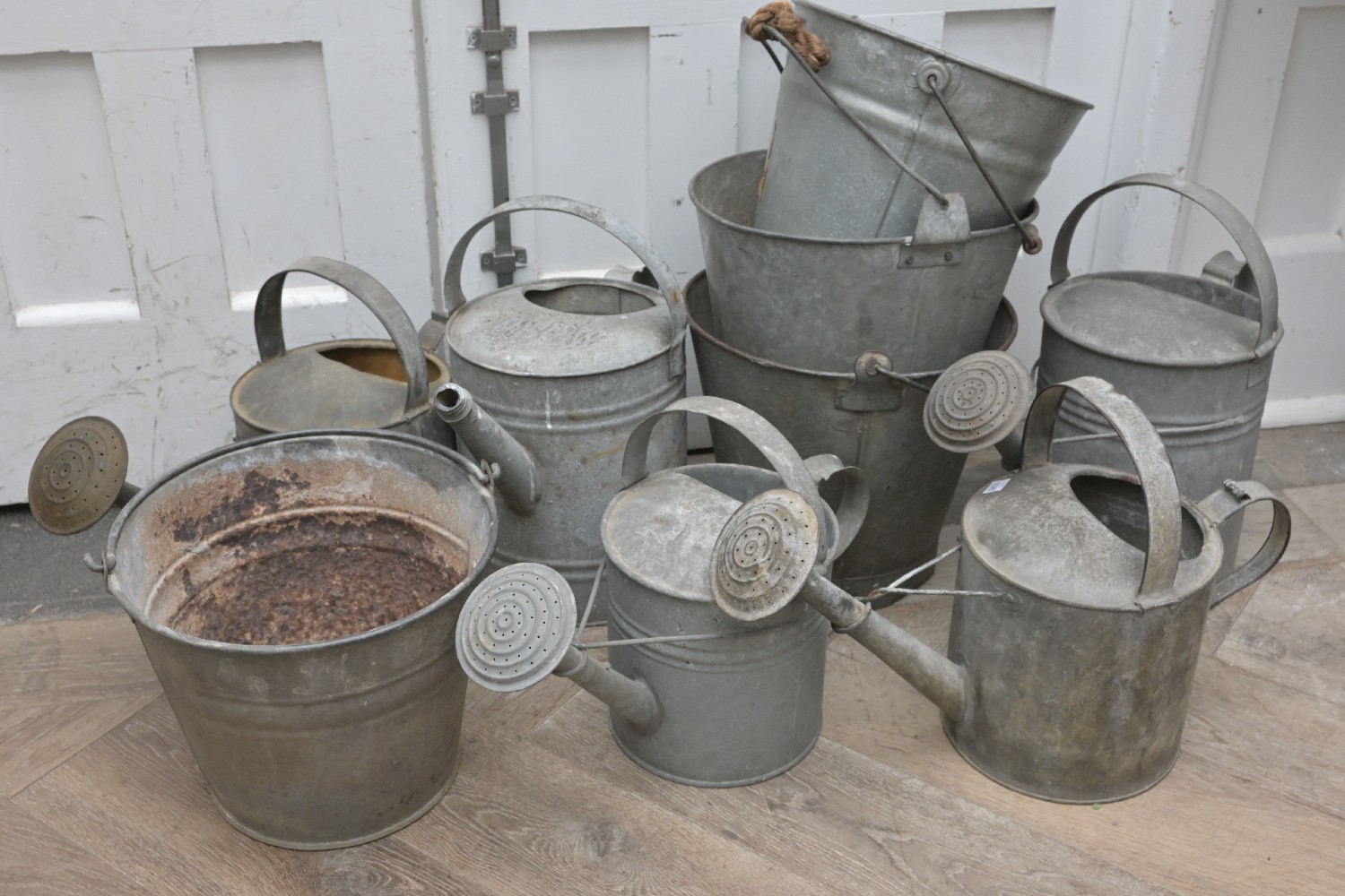 A COLLECTION OF GALVANISED METAL WATERING CANS AND BUCKETS (LEONARD JOEL DELIVERY SIZE: LARGE)