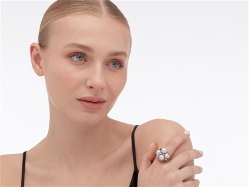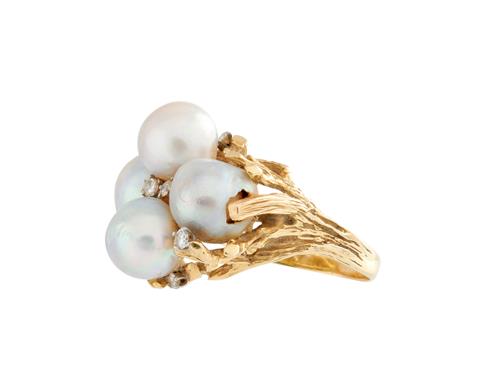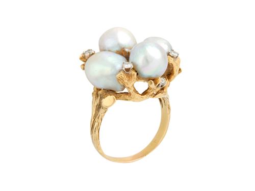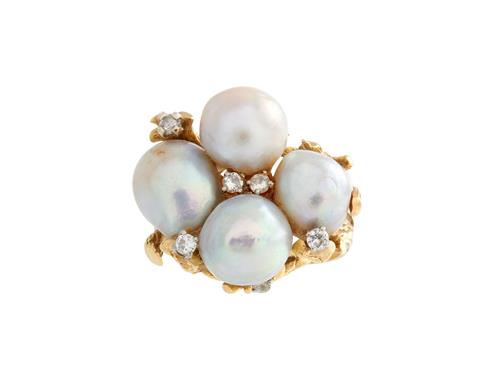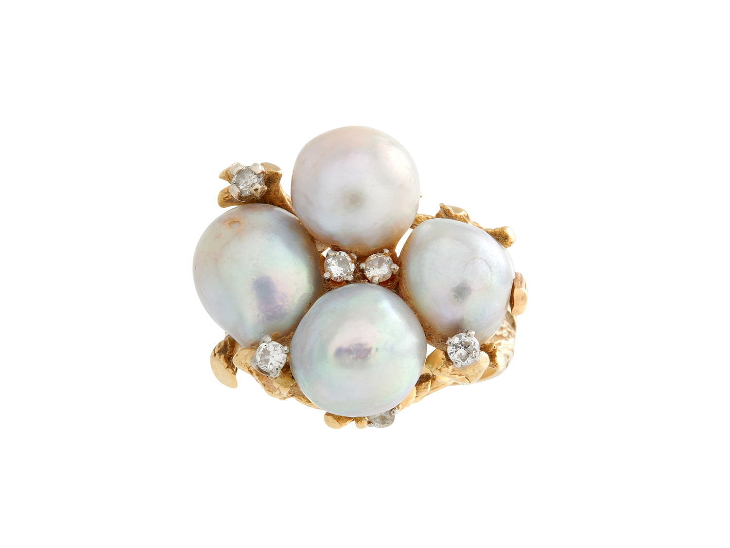Of cluster design, comprising four semi-baroque pearls of silver hues measuring approximately 7.76mm by 8.36mm and seven claw-set brilliant-cut diamonds together weighing approximately 0.18 carats, size U.