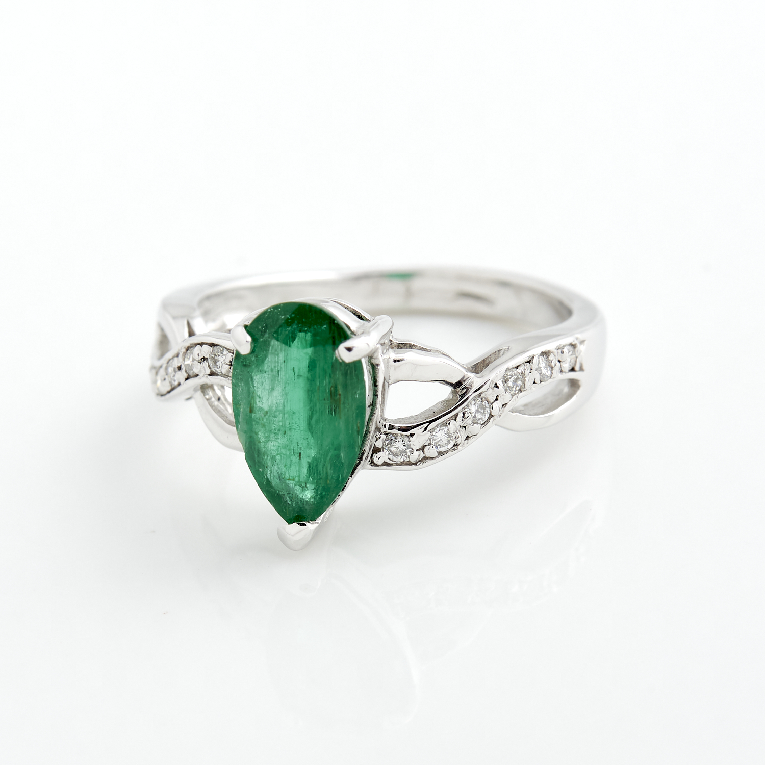 A DIAMOND AND EMERALD RING IN 18CT WHITE GOLD, THE DIAMOND WEIGHING 0.12CTS, THE EMERALD WEIGHING 1.2CTS, SIZE M