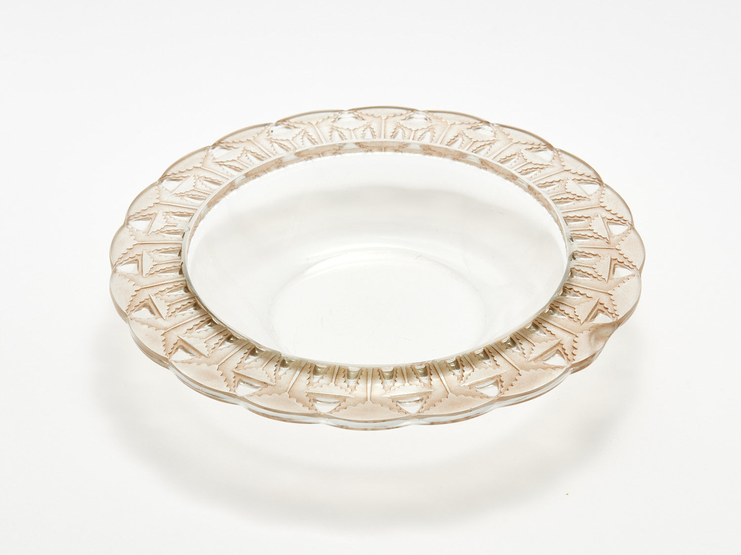 AN ART DECO PRESSED GLASS BOWL, SIGNED LALIQUE FRANCE TO BASE (A/F), DIA.26.5CM, LEONARD JOEL DELIVERY SIZE: SMALL