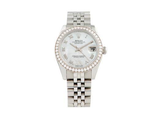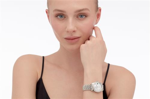 Dial: mother of pearl, diamond-set 6 o'clock hour marker, magnified date aperture at 3