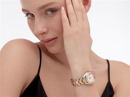 Dial: white mother of pearl, applied gilt circled diamond hour markers, date aperture at 3