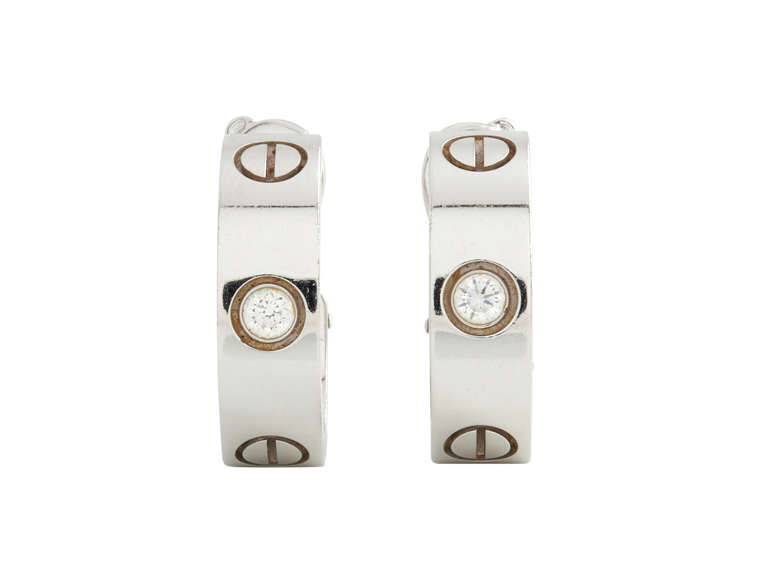 Each hoop centring a brilliant-cut diamond, flanked by applied screwhead motifs, the diamonds together weighing approximately 0.15 carats, to post and clip fittings, signed Cartier and numbered PI3624, length 18mm.