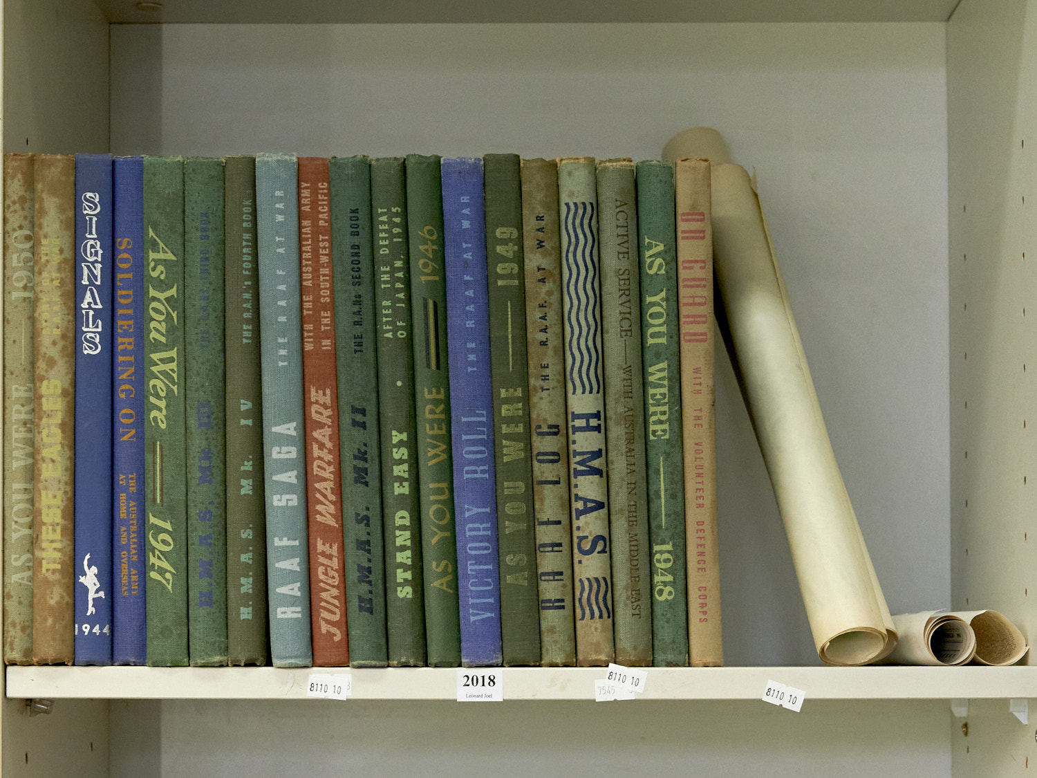 A SHELF OF VINTAGE AUSTRALIAN MILITARY BOOKS TOGETHER WITH FOUR POSTERS, LEONARD JOEL DELIVERY SIZE: MEDIUM