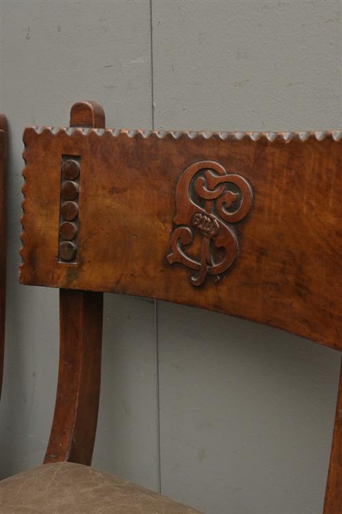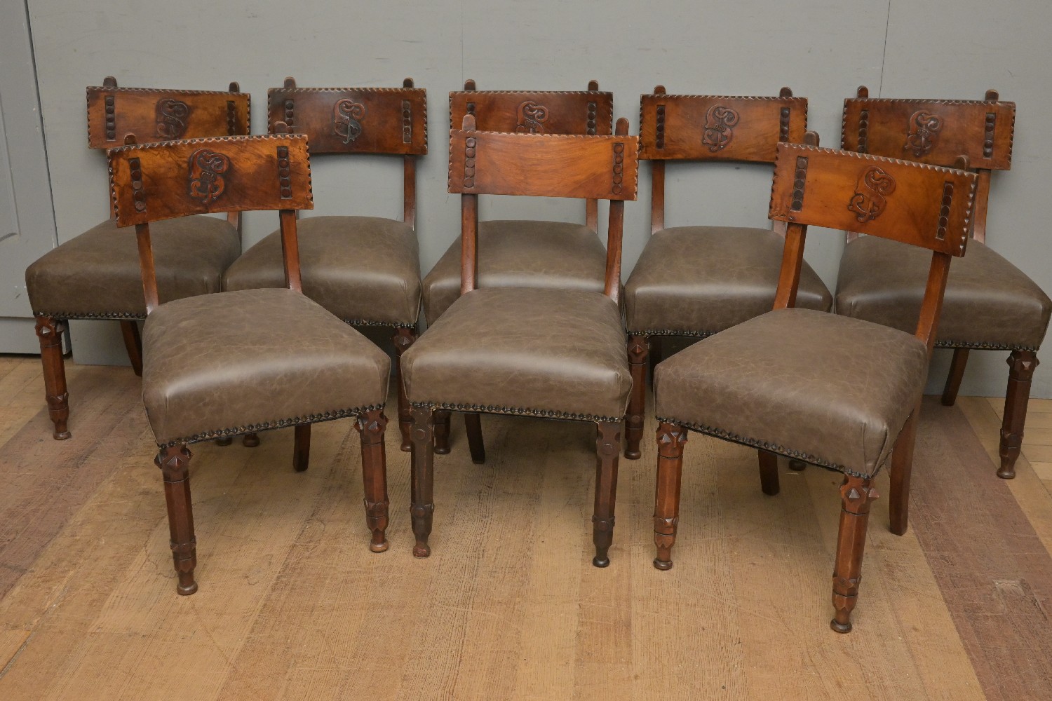 A SET OF EIGHT VICTORIAN MAHOGANY DINING CHAIRS, WITH CARVED BACKS AND LEATHER-UPHOLSTERED SEATS (86H X 51W X 52D CM) (LEONARD JOEL DELIVERY SIZE: X-LARGE)