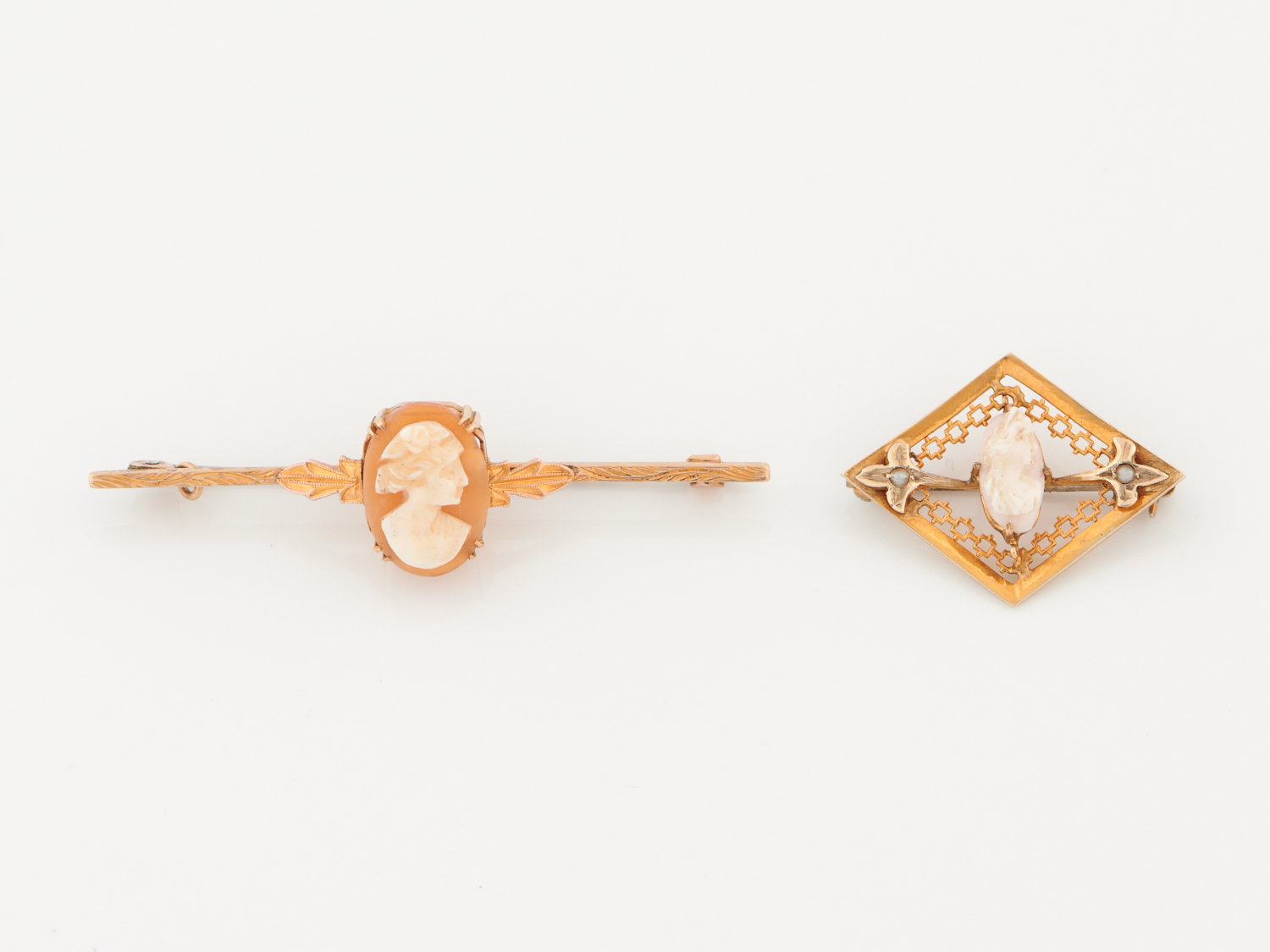TWO CAMEO BROOCHES MOUNTED IN 9CT GOLD, 5.3GMS