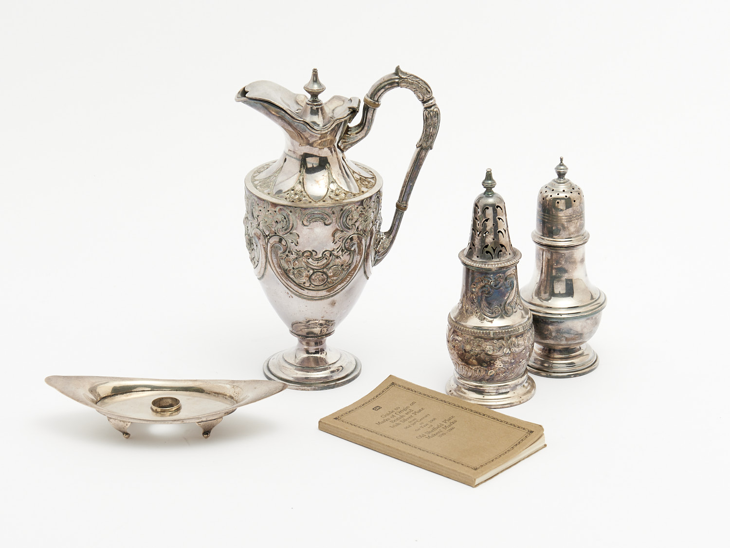 A DECORATIVE SILVER PLATE EWER, TOGETHER WITH TWO MUFFINEERS, A STERLING SILVER CANDLE HOLDER AND 'GUIDE TO MARKS OF ORIGIN, IRISH SILVER PLATE' H.24CM (TALLEST), LEONARD JOEL DELIVERY SIZE: SMALL