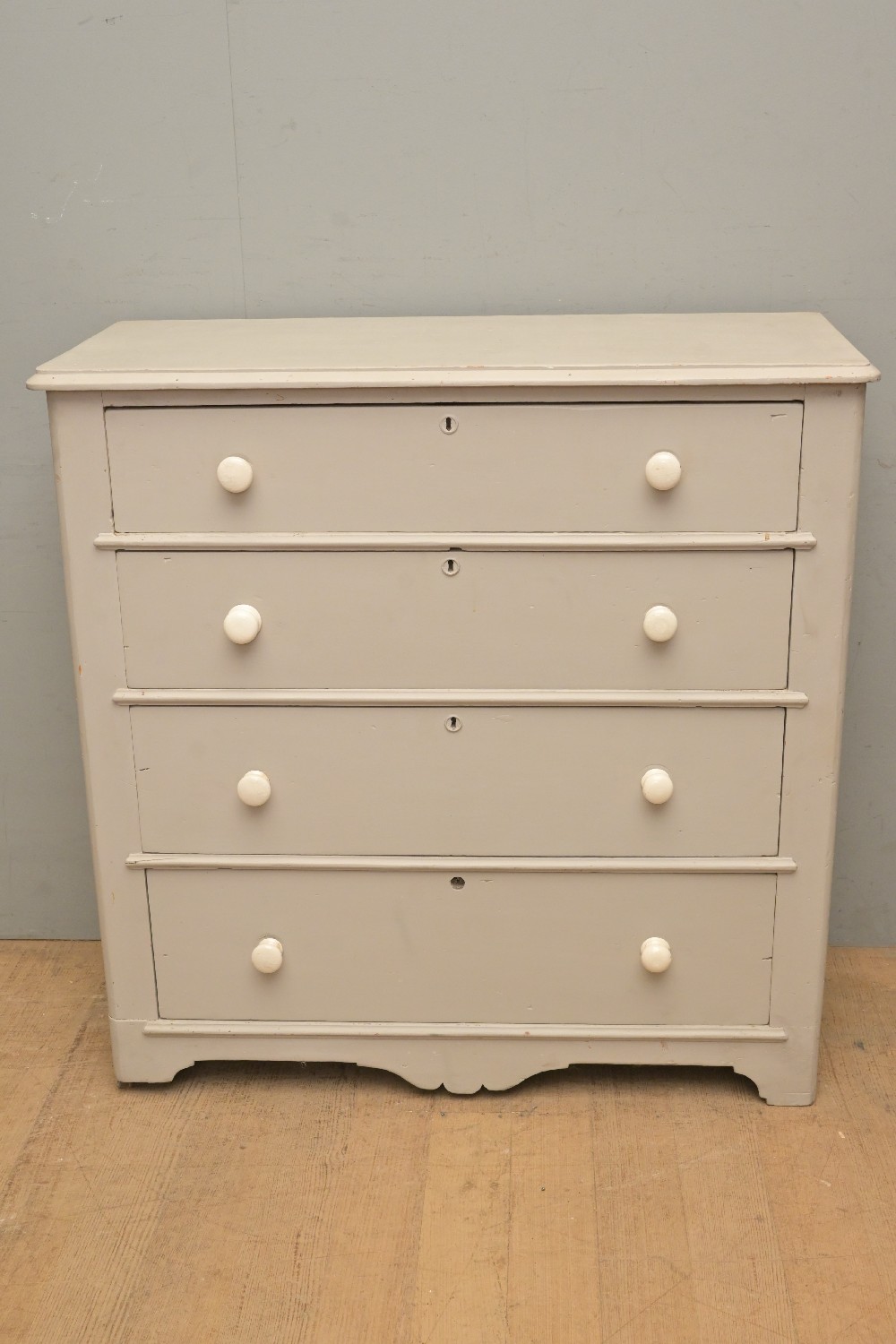 A PAINTED FOUR DRAWER CHEST WITH CERAMIC KNOBS (A/F) (100H X 100W X 46D CM) (LEONARD JOEL DELIVERY SIZE: X-LARGE)