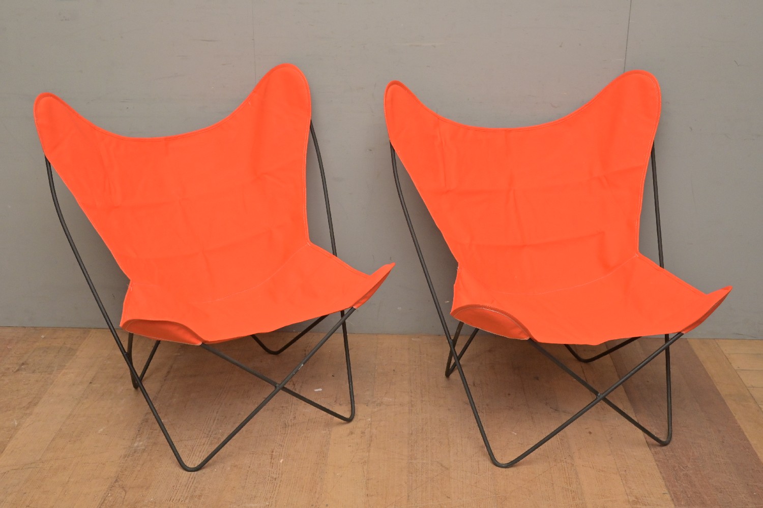 A PAIR OF 1960S AUSTRALIAN BUTTERFLY CHAIRS WITH NEW ORANGE CANVAS COVERS (A/F) (87H X 83W X 75D CM) (LEONARD JOEL DELIVERY SIZE: LARGE)