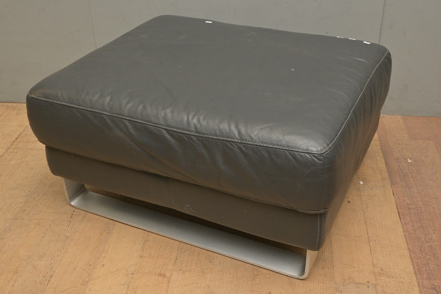 A LEATHER AND METAL BASED OTTOMAN (A/F) (44H X 85W X 74D CM) (LEONARD JOEL DELIVERY SIZE: X-LARGE)