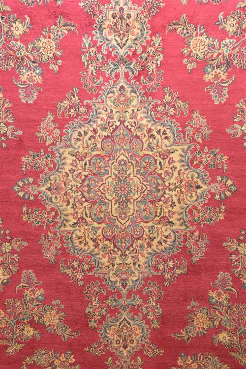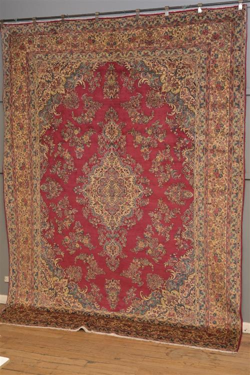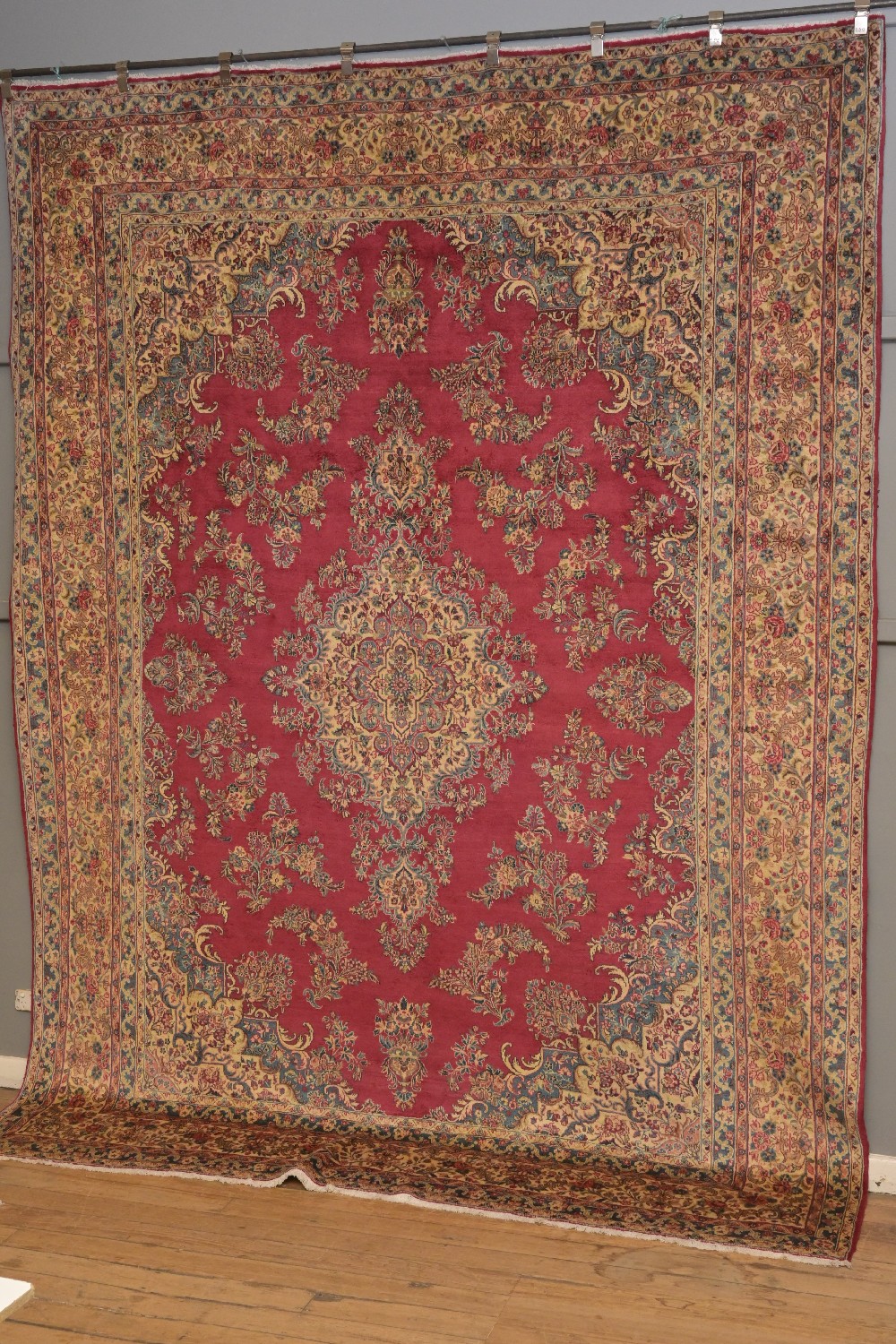 AN ELEGANT KERMAN RAVAR DESIGN CARPET WITH A SHAHABAFT HAMADAN WEAVE, 100% WOOL HIGH PILE. CLASSIC KERMAN RAVAR DESIGN OF CENTRAL ANTIQUE STYLE ELONGATED MEDALLION OF FLORAL SPRAYS SET WITHIN A RUBY RED FIELD OF BEAUTIFUL BLOSSOMING FLORAL SPRAYS AND URNS BEARING FLOWERS. UNIQUE CORNER MEDALLIONS. FLORAL BORDERS THROUGHOUT. SIZE: 350 X 267 CM. ORIGIN: PERSIA - RRP: $5,300. DOCUMENTATION OF AUTHENTICITY INCLUDED.