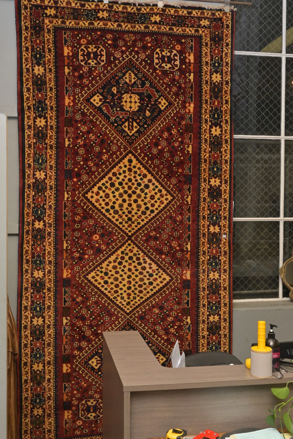 A TRIBAL PERSIAN YALLAMEH QASHQAIE RUG, 100% SOLID AND DENSE PLUSH WOOL, NATURAL DYES. HAND-KNOTTED TRIBAL WEAVE WITH TRADITIONAL TRIBAL DESIGN OF CONTINUING TRIPLE DIAMOND HOOKED MEDALLIONS CONTAINING AMULETS AND MINIATURE ROSETTES, ON A CLARET RED FIELD CONTAINING TRIBAL ROSETTE MOTIFS. CORNER MEDALLIONS OF AMULETS. BORDER OF STAR AND ROSETTES MOTIFS. SIZE: 330 X 160 CM – RRP: $5,100. DOCUMENTATION OF AUTHENTICITY INCLUDED.