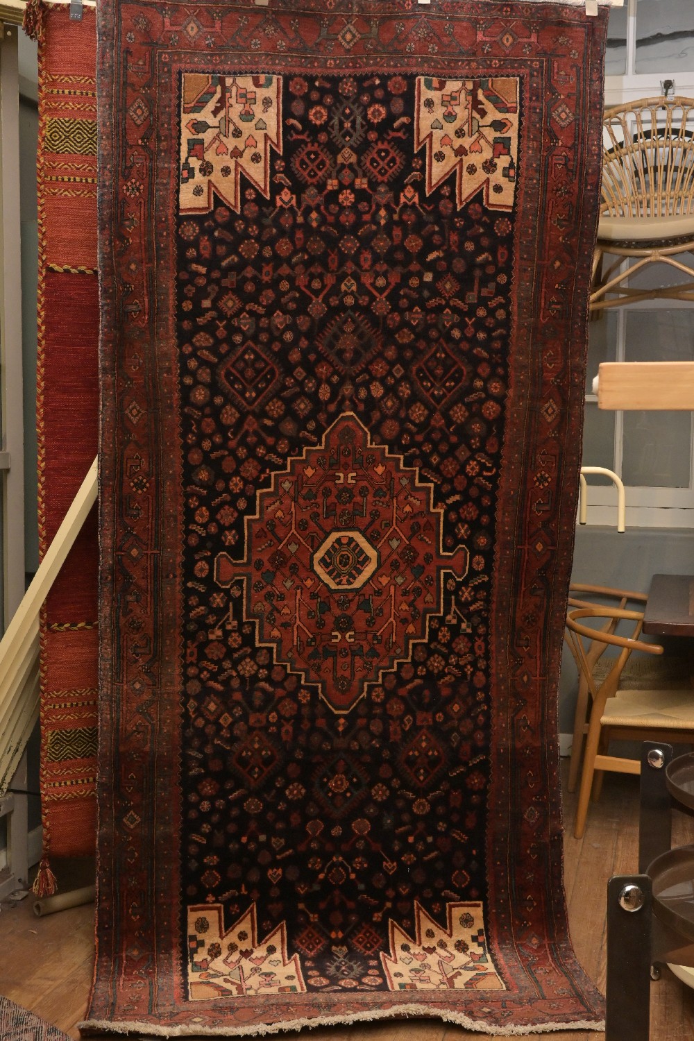 A TRIBAL PERSIAN SONGOR BIDJAR RUG, HAND KNOTTED WITH 100% WOOL, WITH 100% ORGANIC NATURAL DYES, SOLID WEAVE. CENTRAL GEOMETRIC MEDALLION ON A NAVY FIELD OF MINIATURE ROSETTES AND TRIBAL MOTIFS. BORDER OF ROSETTES AND GEOMETRIC MOTIFS. NATURAL ABRASH. SIZE: 292 X 130 CM. ORIGIN: PERSIA – RRP: $2,100. DOCUMENTATION OF AUTHENTICITY INCLUDED