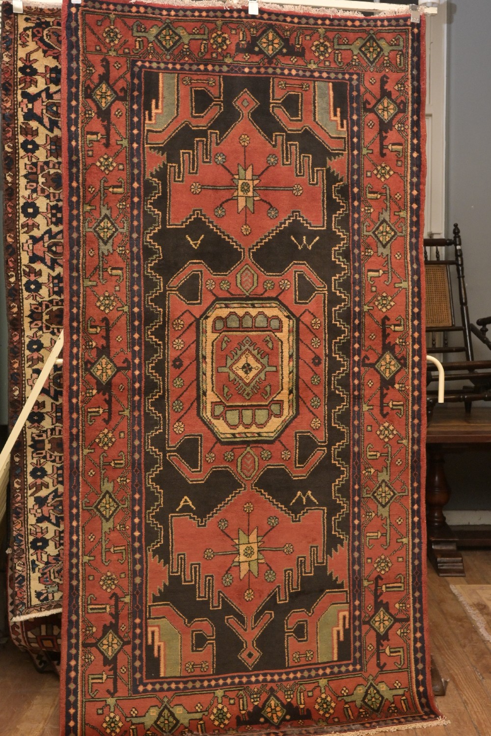 A 1980s GEOMETRIC DESIGN PERSIAN TRIBAL TAROOM RUG. 100% WOOL & NATURAL DYES. TRIBAL CENTRAL ELONGATED TRIPLE MEDALLIONS CONTAINING AMULETS IN A RED TONE HUE. IN A CHARCOAL FIELD. BORDER OF ROSETTES AND GEOMETRIC MOTIFS. SIZE: 258X 129 CM. ORIGIN: PERSIA – RRP: $1,800. DOCUMENTATION OF AUTHENTICITY INCLUDED.