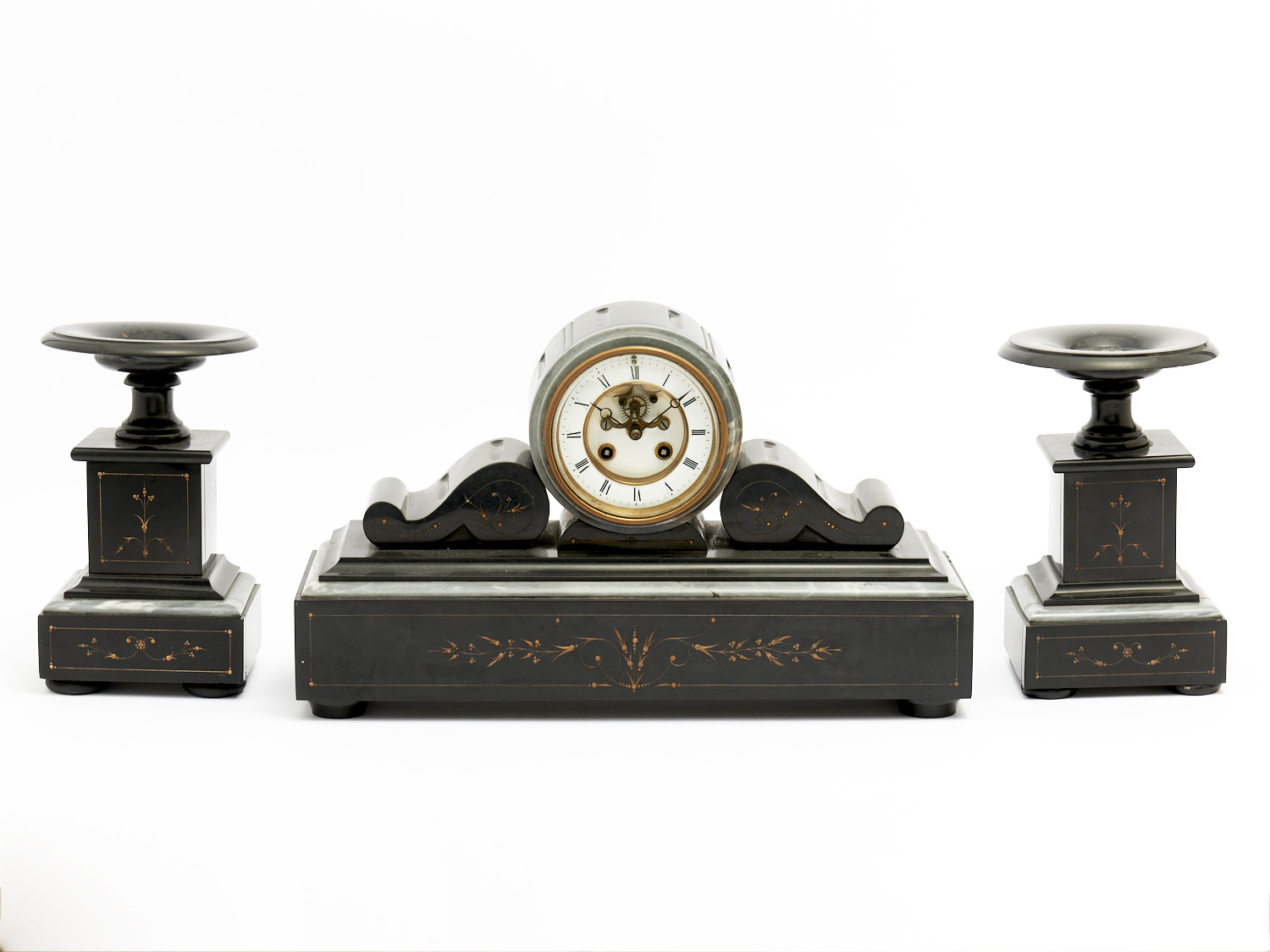 A FRENCH THREE PIECE CLOCK SET IN BLACK SLATE AND GREY MARBLE CASE WITH EIGHT DAY TIME AND STRIKE MOVEMENT, OPEN ESCAPEMENT, ROMAN NUMERALS AND URN GARNITURES, 19TH CENTURY W.44.5CM (CLOCK), LEONARD JOEL DELIVERY SIZE: MEDIUM