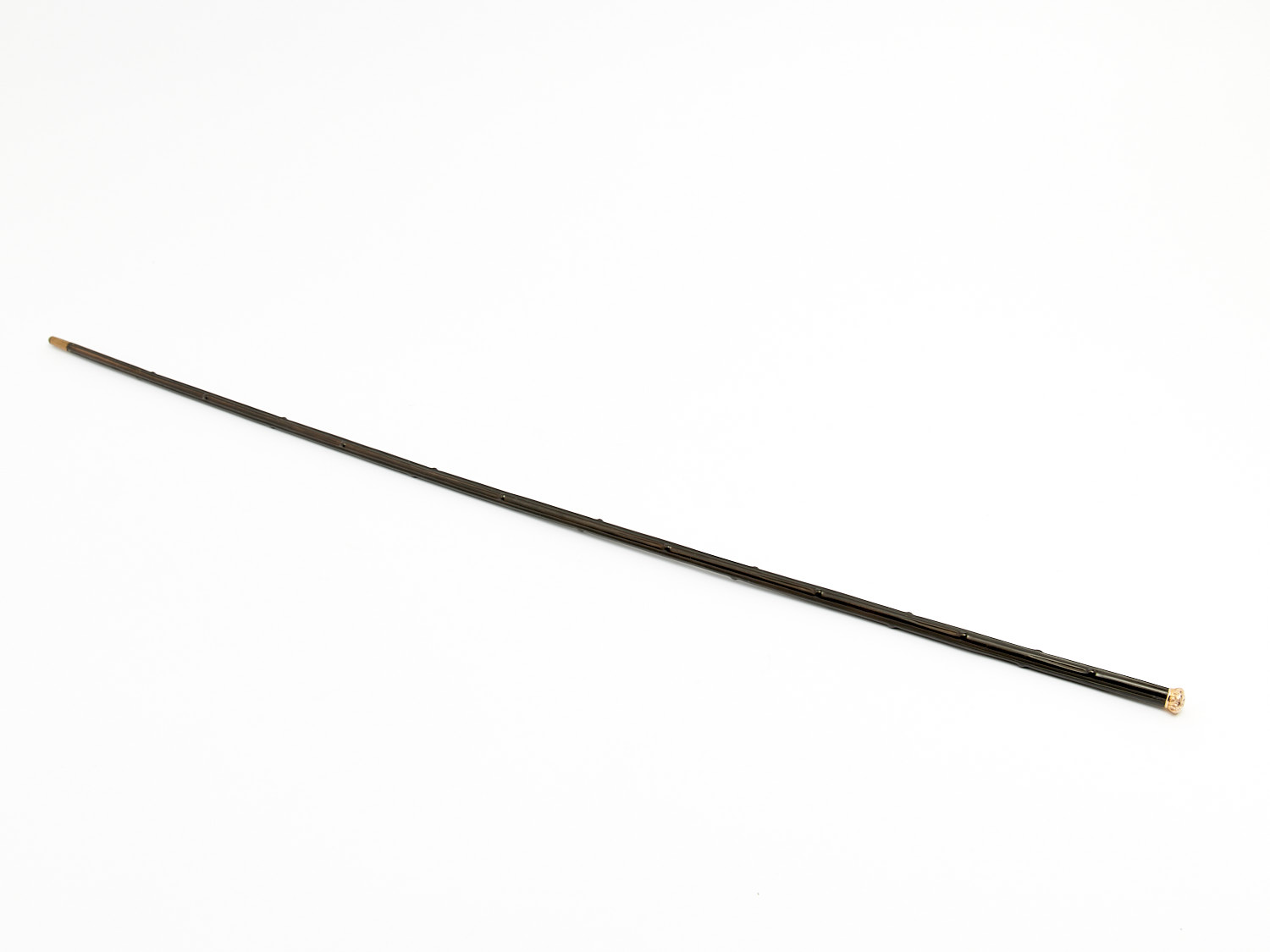 AN ANTIQUE WALKING CANE WITH GOLD FINISHED TOP ON A BALEEN SHAFT WITH BRASS FERULE L.86.5CM, LEONARD JOEL DELIVERY SIZE: SMALL