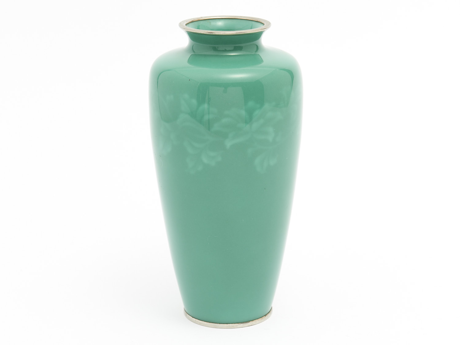AN ANDO JAPANESE JADE GREEN CLOISONNÉ VASE WITH SILVER RIM AND SEAL MARK TO BASE H.24CM, LEONARD JOEL DELIVERY SIZE: SMALL