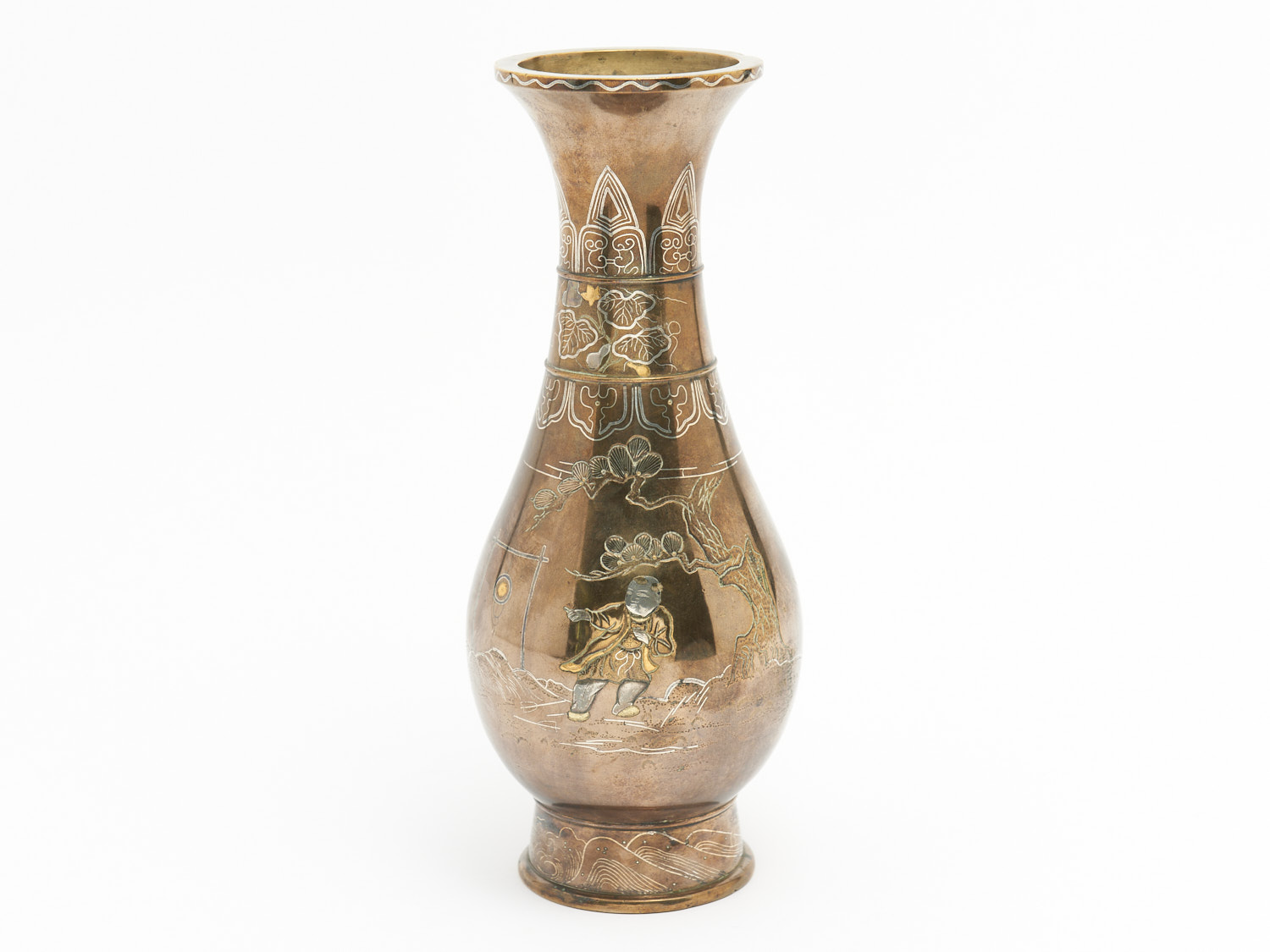 A JAPANESE BRONZE VASE INLAID WITH SILVER AND GOLD, MEIJI PERIOD - 19TH CENTURY H.31.5CM, LEONARD JOEL DELIVERY SIZE: SMALL