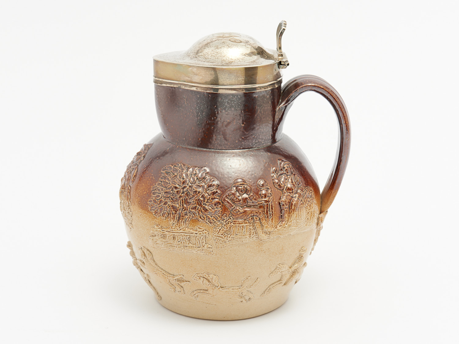 A GEORGIAN POTTERY HARVEST JUG WITH STERLING SILVER TOP H.23.5CM, LEONARD JOEL DELIVERY SIZE: SMALL