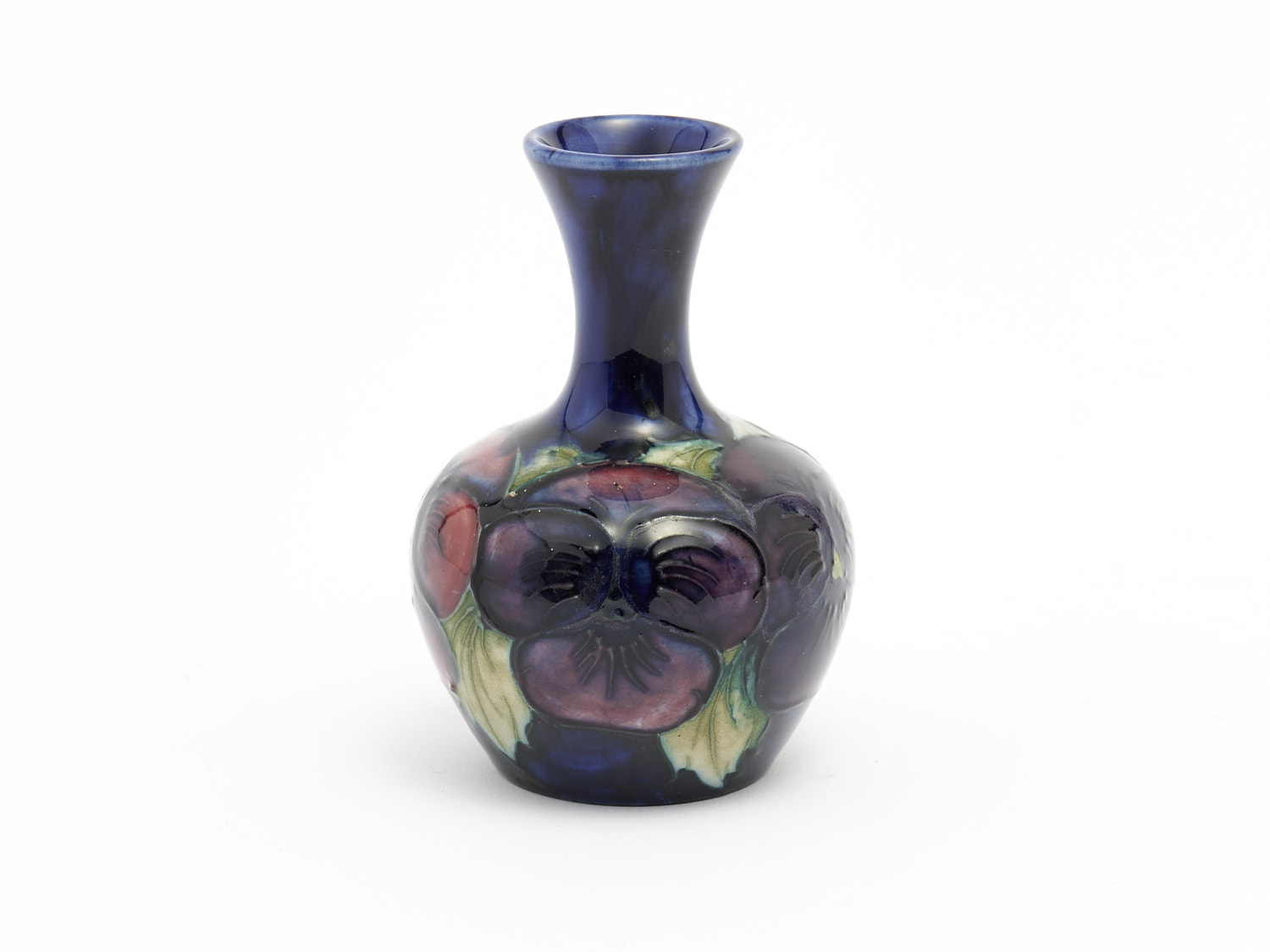 A MOORCROFT PANSY PATTERN ENGLISH POTTERY MINIATURE VASE ON BLUE GROUND H.9.5CM, LEONARD JOEL DELIVERY SIZE: SMALL