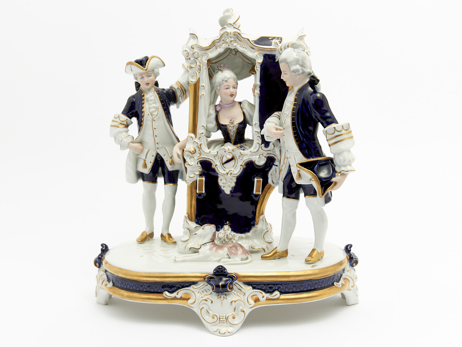A ROYAL DUX CZECHOSLOVAKIAN PORCELAIN FIGURAL GROUP OF A LADY IN SEDAN WITH FOOTMEN, EARLY 20TH CENTURY WITH TRIANGLE FACTORY MARK TO BASE H.40CM, LEONARD JOEL DELIVERY SIZE: LARGE