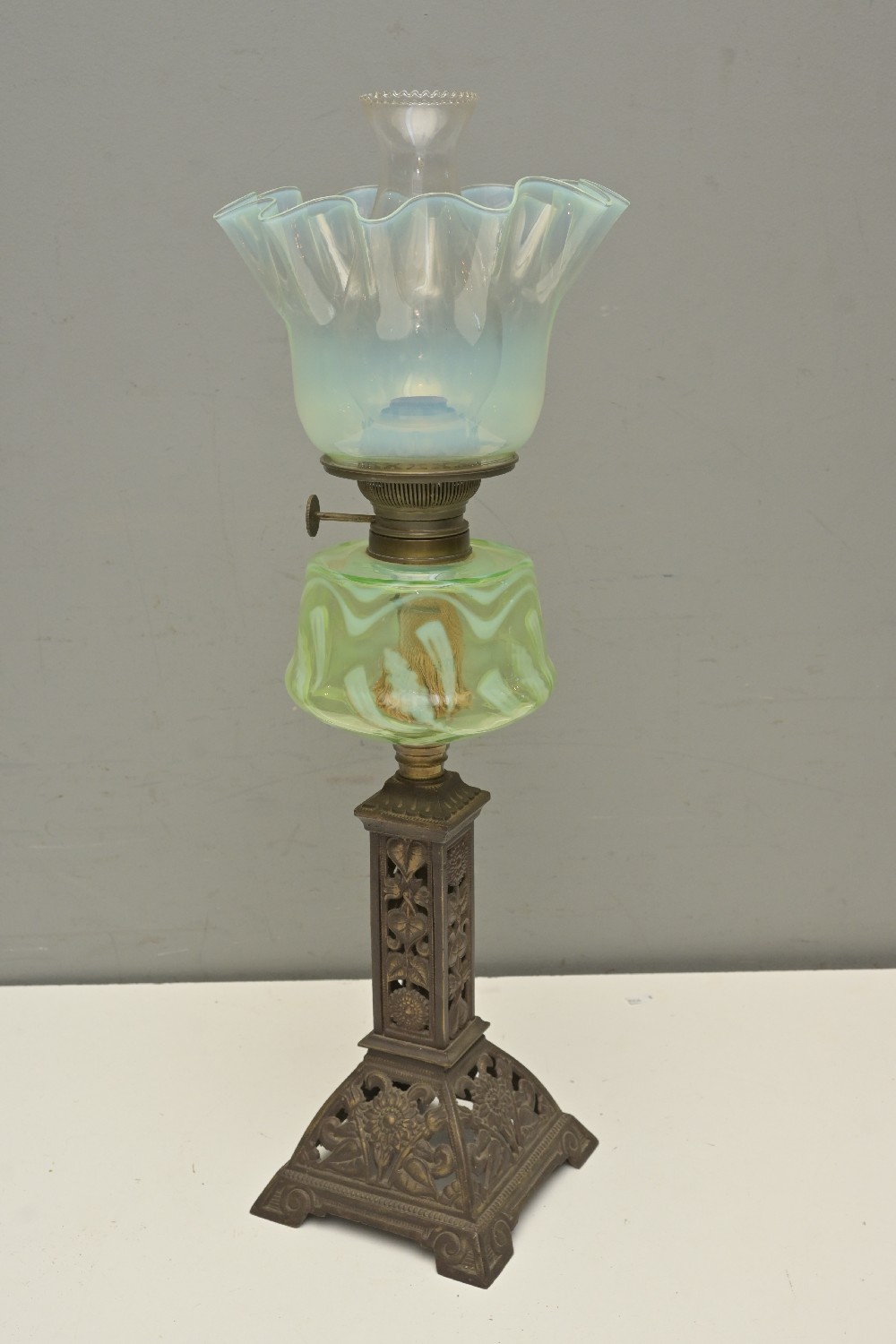 AN ANTIQUE 19TH CENTURY BANQUET LAMP WITH LEMON VASELINE GLASS SHADE GREEN VASELINE FONT SINGLE BURNER AND BRONZE FLORAL BASE (66H CM) (LEONARD JOEL DELIVERY SIZE: MEDIUM)