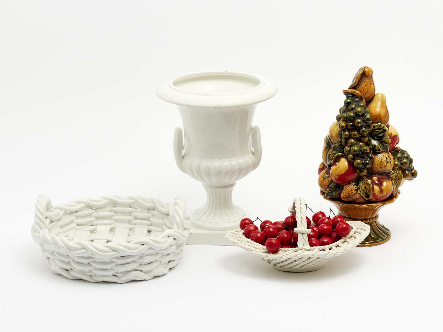 A GROUP OF FOUR 1940S ITALIAN GLAZED CERAMIC WARES INCLUDING A TWO HANDLED URN, WOVEN BASKET AND FRUIT URN H.31CM (TALLEST), LEONARD JOEL DELIVERY SIZE: LARGE