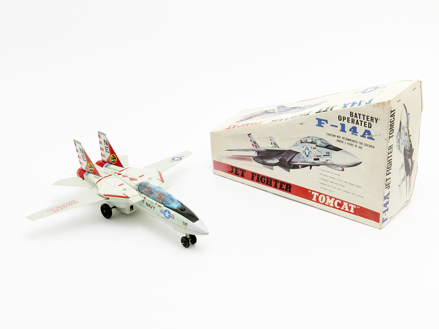 A RARE JAPANESE 1960S BOXED WORKING BATTERY OPERATED TOMCAT TIN JET FIGHTER L.36CM, LEONARD JOEL DELIVERY SIZE: SMALL