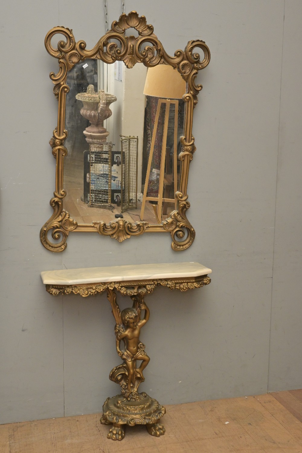 AN ITALIAN SCULPTURAL CONSOLE TABLE AND A WALL MIRROR OF SIMILAR STYLE (MIRROR 106H X 76W CM) (LEONARD JOEL DELIVERY SIZE: X-LARGE)