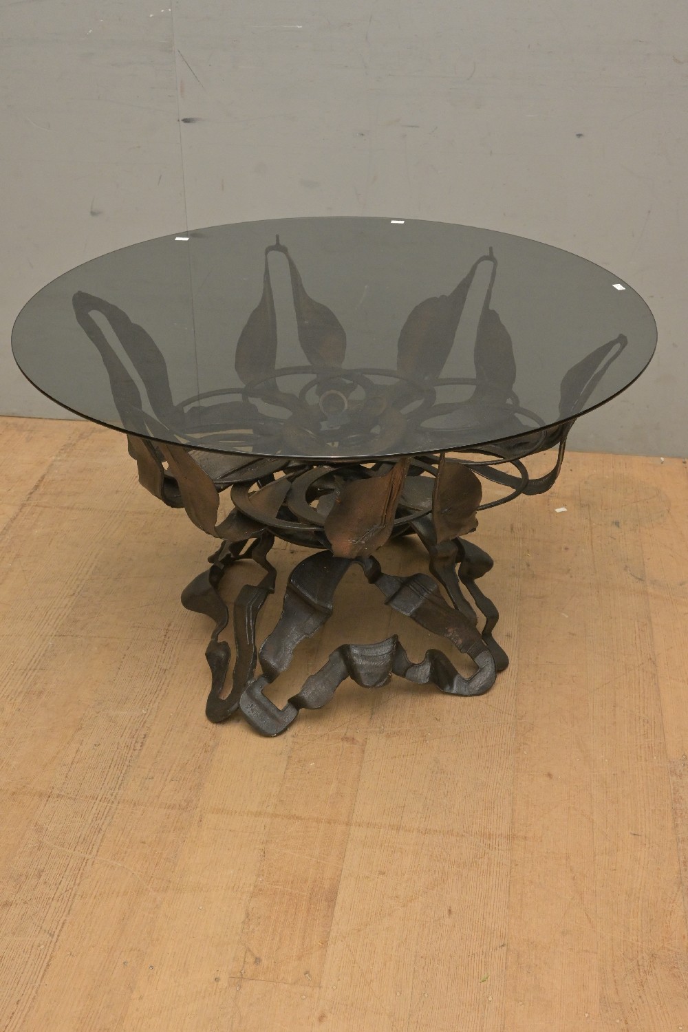 A MID-CENTURY BRUTALIST STYLE WROUGHT IRON BASED CIRCULAR GLASS TOP COFFEE TABLE (54H X 92D CM) (LEONARD JOEL DELIVERY SIZE: X-LARGE)