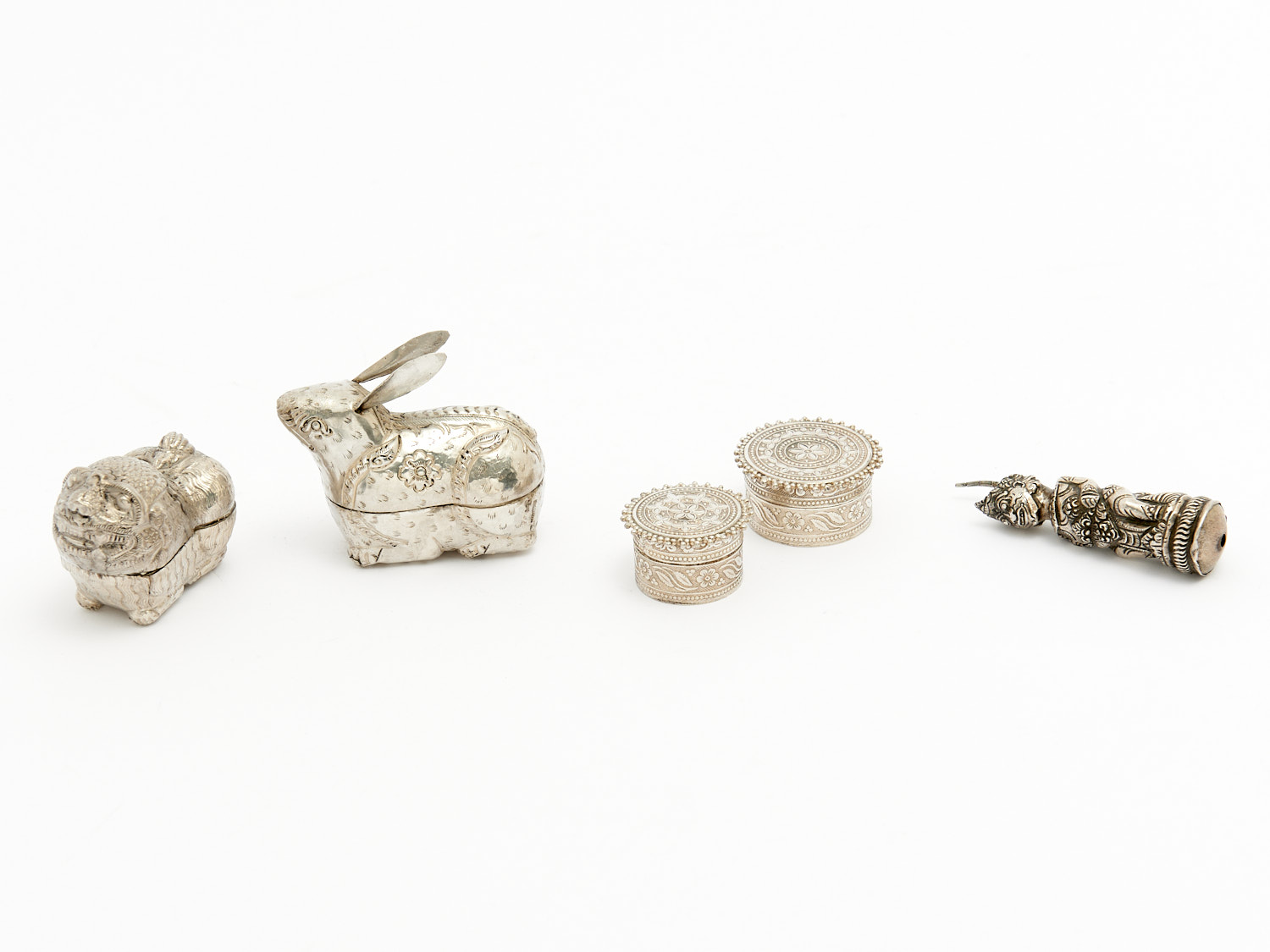 A COLLECTION OF FIVE 19TH CENTURY ORIENTAL SILVER ITEMS INCLUDING FIGURAL LIDDED BOXES AND FIGURAL FINIAL L.9CM (LONGEST), LEONARD JOEL DELIVERY SIZE: SMALL