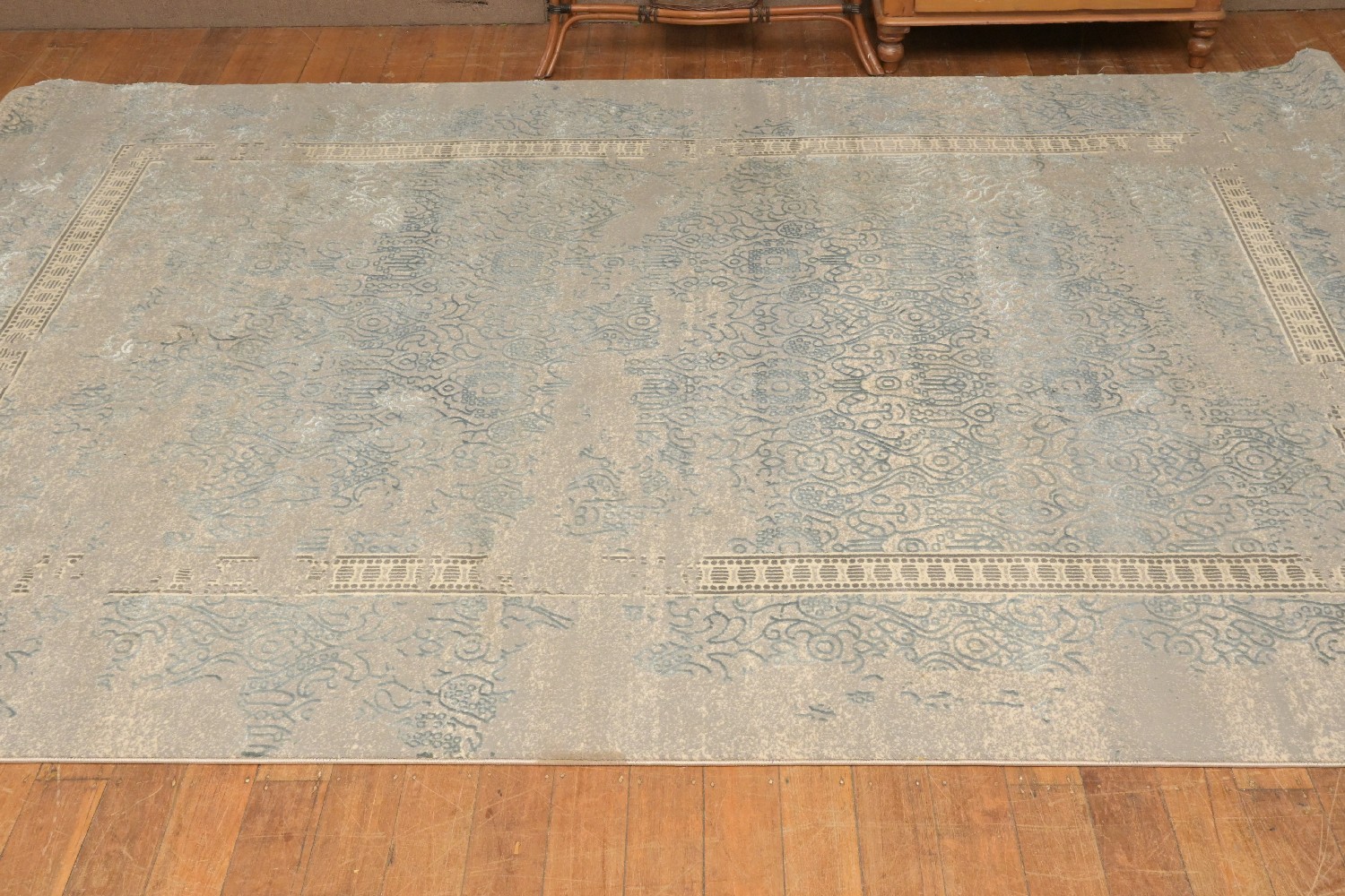 A LARGE CONTEMPORARY RUG IN BLUE, GREY AND CREAM TONES (A/F) (341 X 240 CM) (PLEASE NOTE THIS HEAVY ITEM MUST BE REMOVED BY CARRIERS AT THE CUSTOMER'S EXPENSE. LEONARD JOEL STAFF CANNOT ASSIST CARRYING THIS ITEM) (LARGE ITEM)