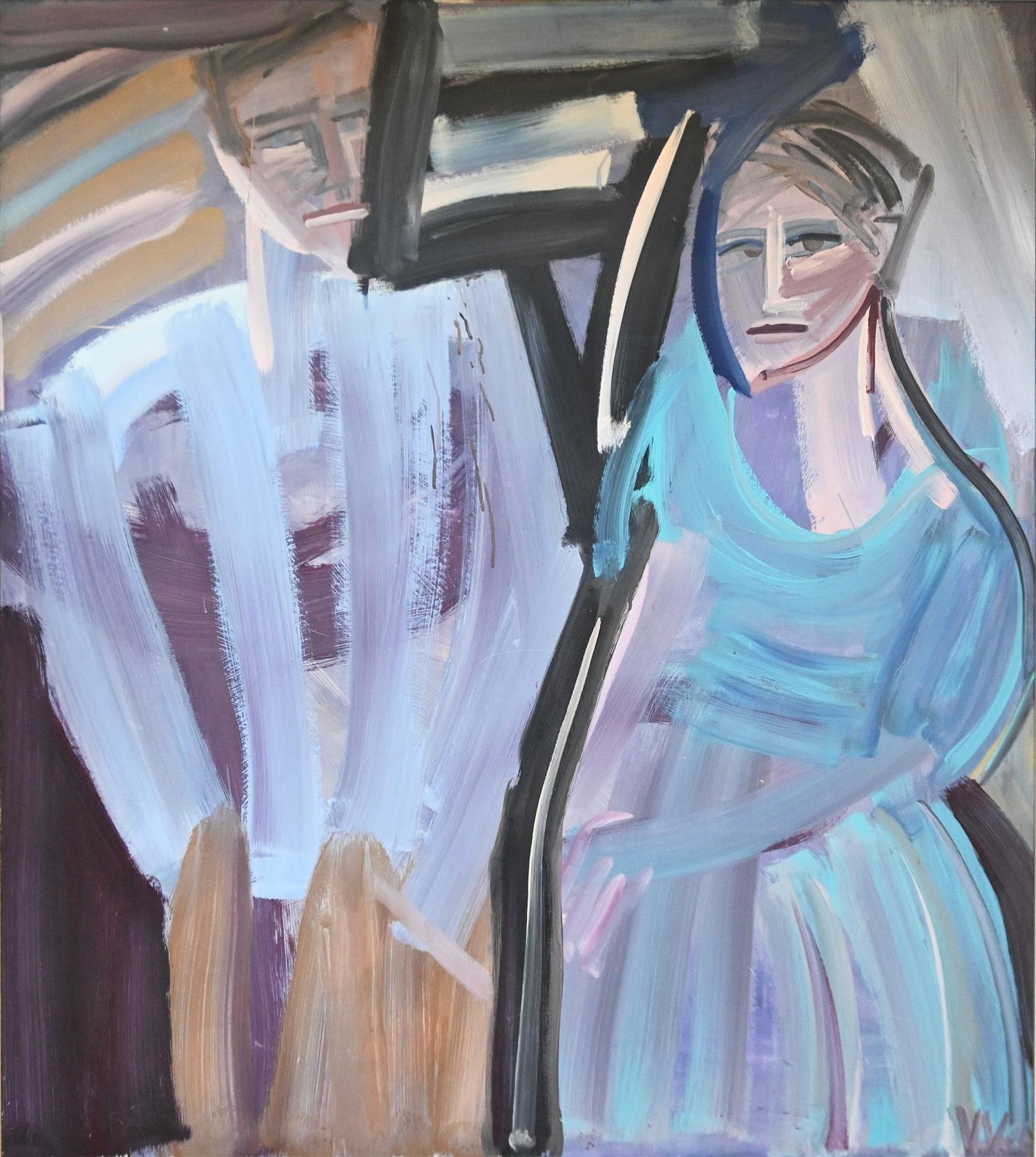 Minor surface scratches, the most visible being in the face in the upper left. Foreign matter in the upper left quadrant and lower right. Framed with metal frame. Overall size: 138.5 x 123cm.