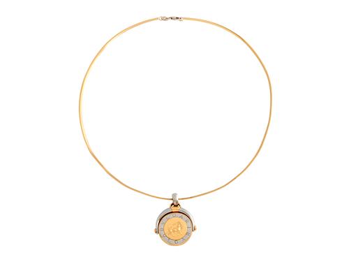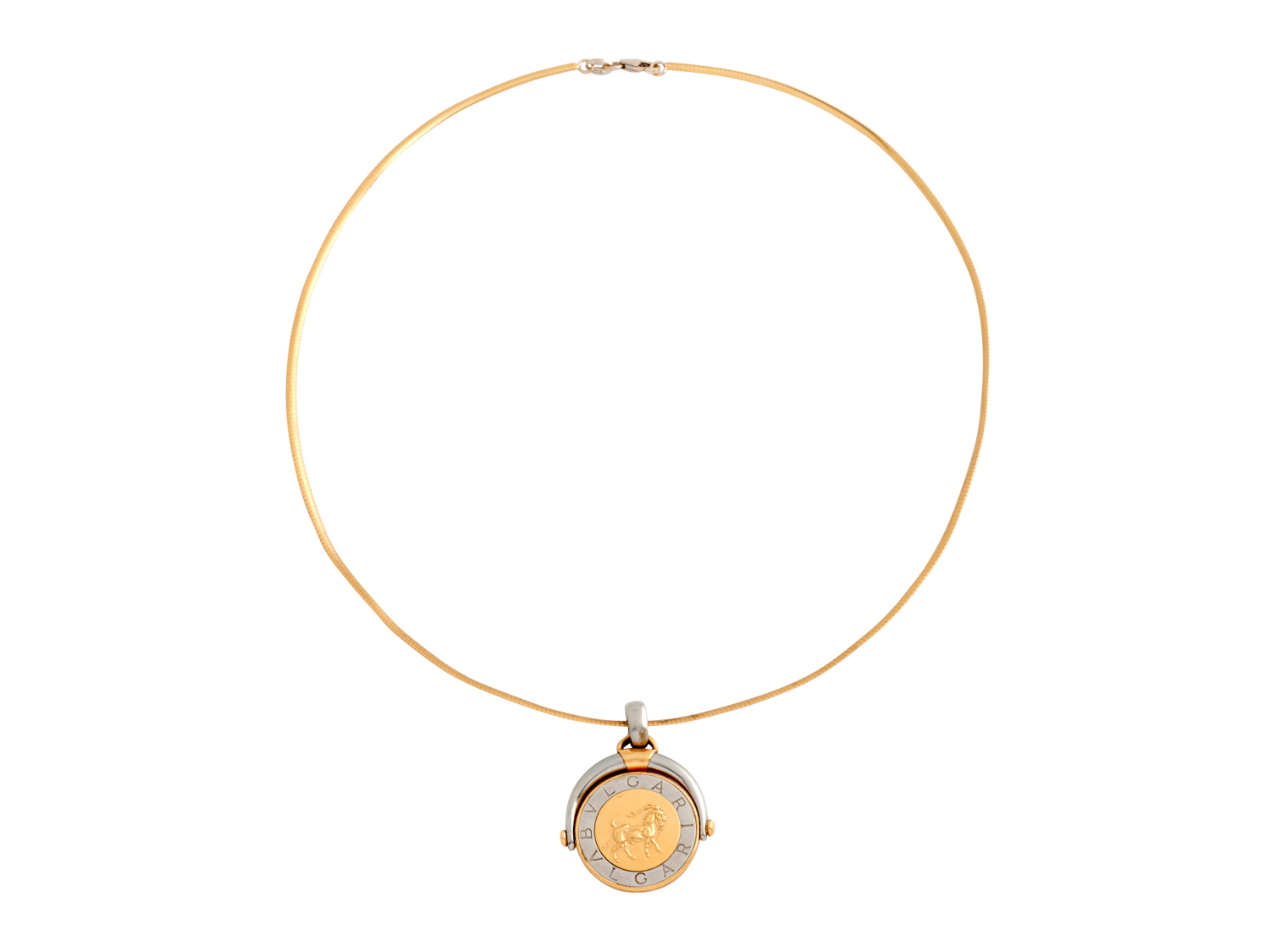 The spinning pendant depicting a Capricorn sea goat within a surround engraved BVLGARI BVLGARI, suspended from a reversible omega collar in two-tone 18ct gold, pendant signed Bulgari, pendant length 35mm, collar length 420mm.