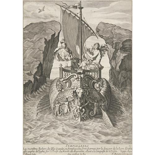 printed in ink lower centre: SYMPLEGADES/ Les inconstans Rochers des Iles Cyanées ou Symplegades, sont charmez par la douceur de la Lyre d'Orphée,/ assis aupres de Typhis sur la Poupe du Navire des Argonautes, allant a la conquete de la Toison.
