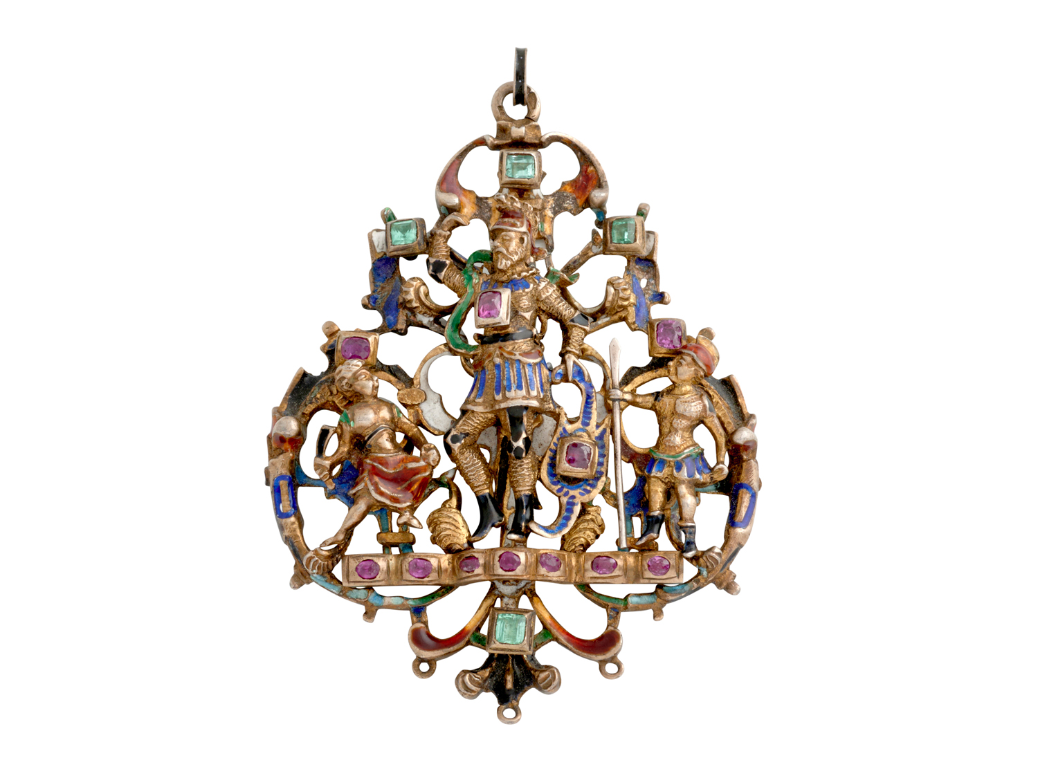 Depicting a crusader flanked by soldiers, set throughout with multicoloured enamel and decorated with square-cut emeralds and oval-cut rubies, the reverse decorated with multicoloured enamel, Austrian marks, Vienna, late 19th century, maker's mark 'HB', length 75mm, width 55mm.