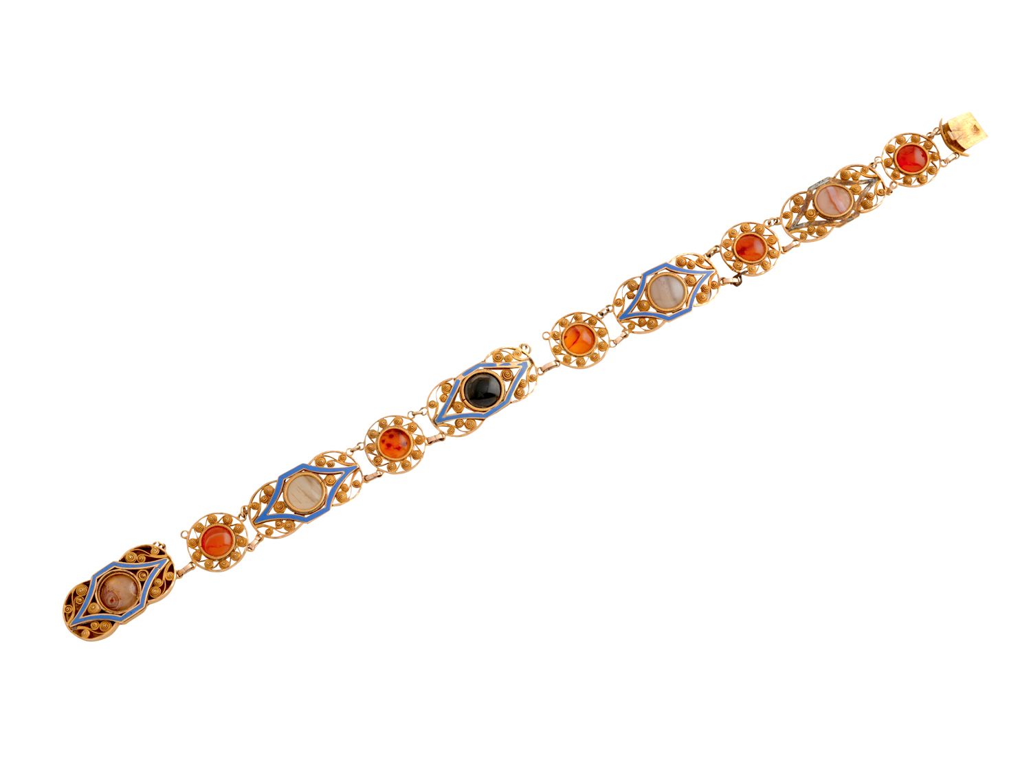Composed of circular and elongated filigree links, each centring a circular agate cut en cabochon with blue enamel accents, completed by a tongue and groove clasp, A/F continental marks, length 190mm, gross weight approximately 12.4 grams.