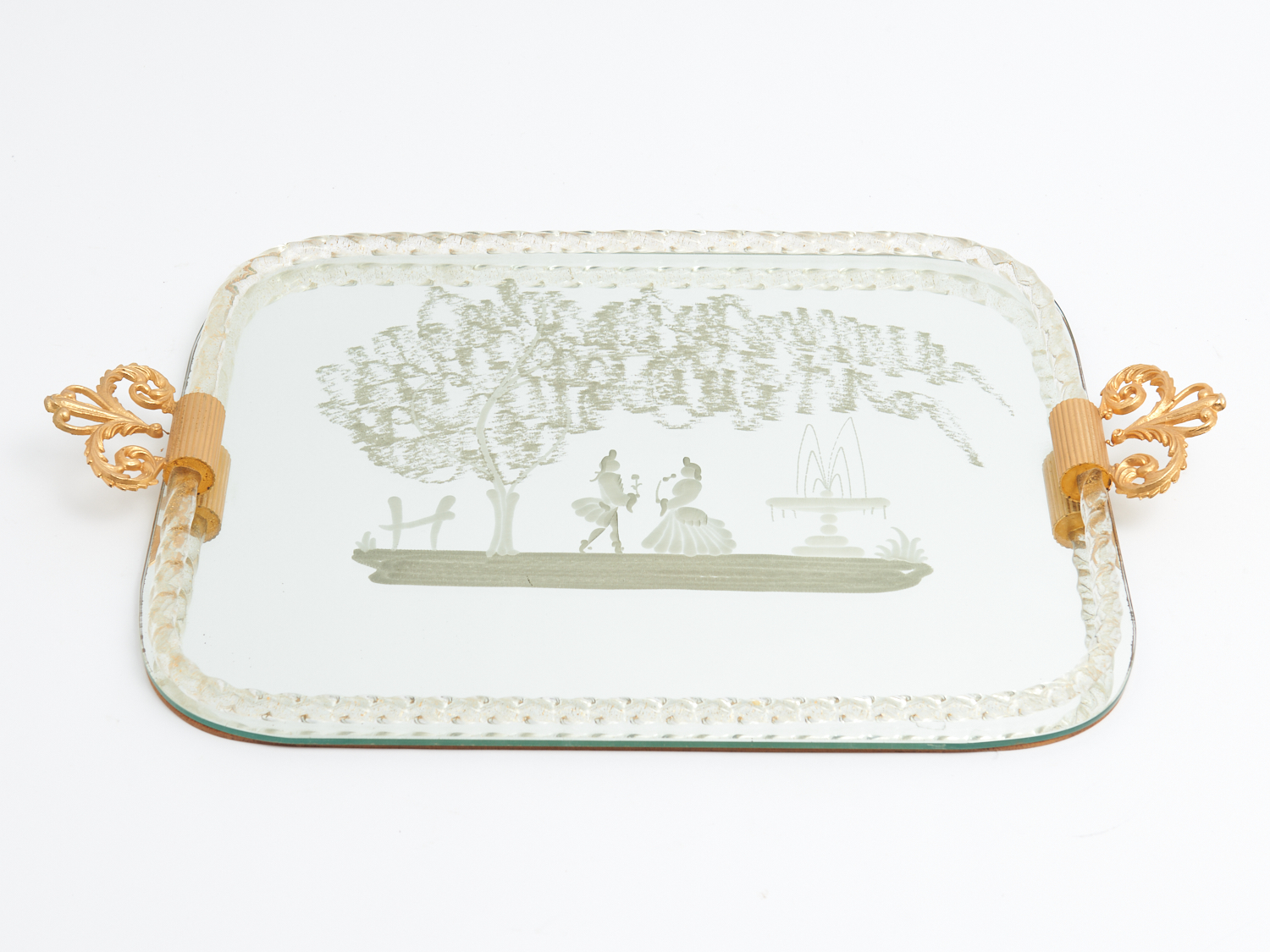 A VENETIAN MIRRORED TRAY WITH ETCHED COURTING SCENE AND TWISTED GLASS DETAILING WITH GOLD INCLUSIONS L.55.5CM, LEONARD JOEL DELIVERY SIZE: MEDIUM