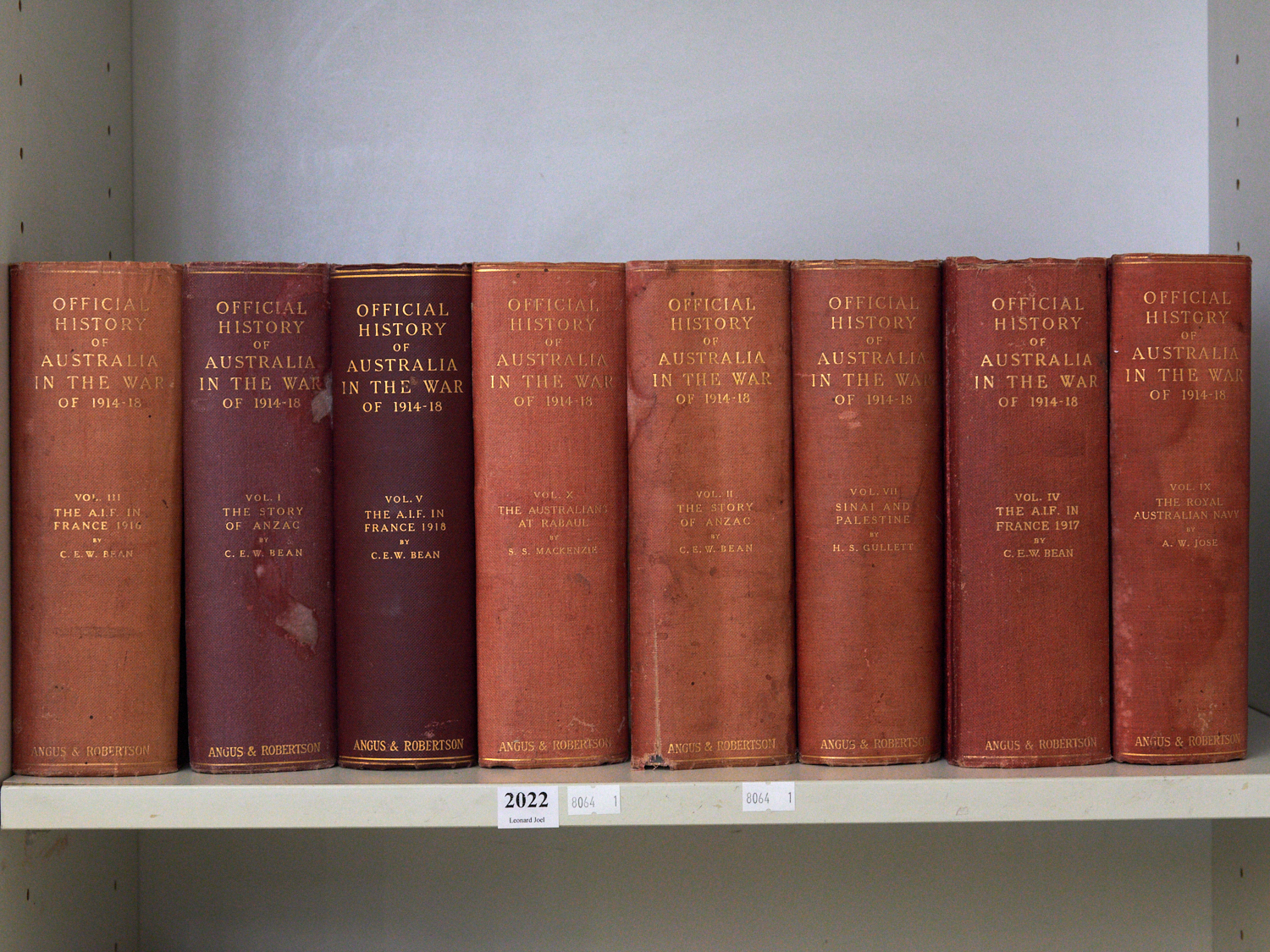 EIGHT VOLUMES 'OFFICIAL HISTORY OF AUSTRALIA IN THE WAR 1914-1918', LEONARD JOEL DELIVERY SIZE: MEDIUM