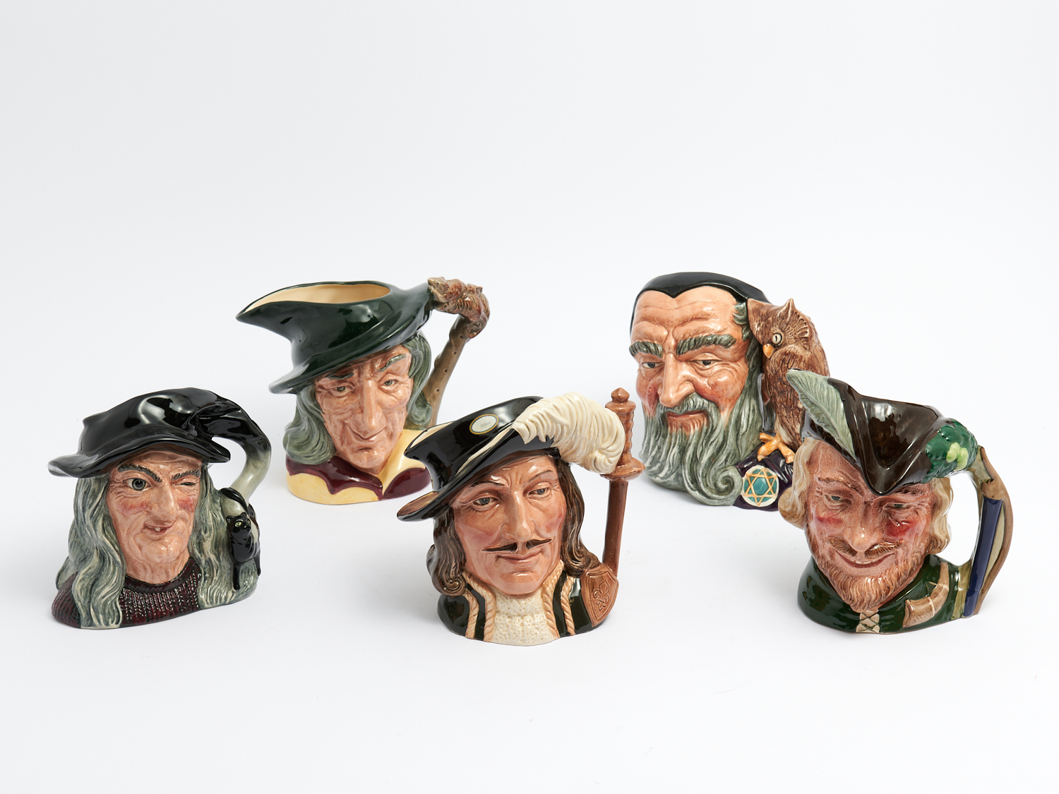 FIVE ROYAL DOULTON CHARACTER JUGS INCLUDING ROBIN HOOD, THE WITCH, THE PIED PIPER AND MERLIN H.19.5CM, LEONARD JOEL DELIVERY SIZE: MEDIUM