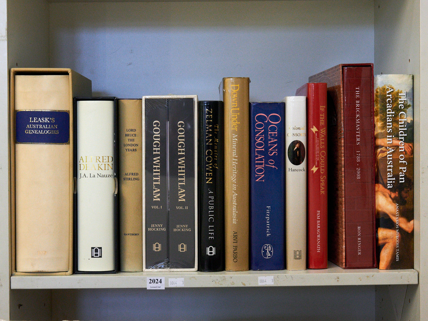 A SHELF OF AUSTRALIAN HISTORICAL REFERENCE INCL. TAMIS 'THE CHILDREN OF PAN ARCADIANS IN AUSTRALIA', 'LEASKS AUSTRALIAN GENEOLOGIES', JENNY HOCKING 'GOUGH WHITLAM' (TWO VOLS., SLIPCASE, SEALED), BARGWANATH 'IF THE WALLS COULD SPEAK' ETC., LEONARD JOEL DELIVERY SIZE: MEDIUM