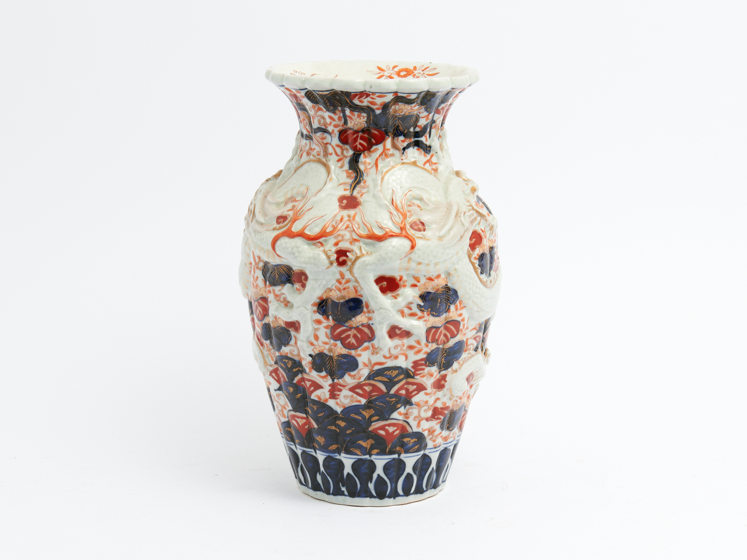 A JAPANESE IMARI VASE WITH DRAGON RELIEF DETAILING, MEIJI PERIOD H. 33CM, LEONARD JOEL DELIVERY SIZE: MEDIUM