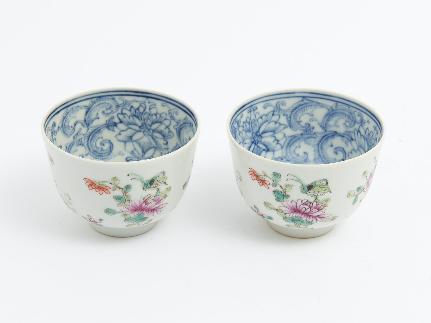 A PAIR OF FAMILLE ROSE PORCELAIN CUPS WITH BLUE AND WHITE INTERIOR, TONG ZHI MARK DIA.8.5CM, LEONARD JOEL DELIVERY SIZE: SMALL
