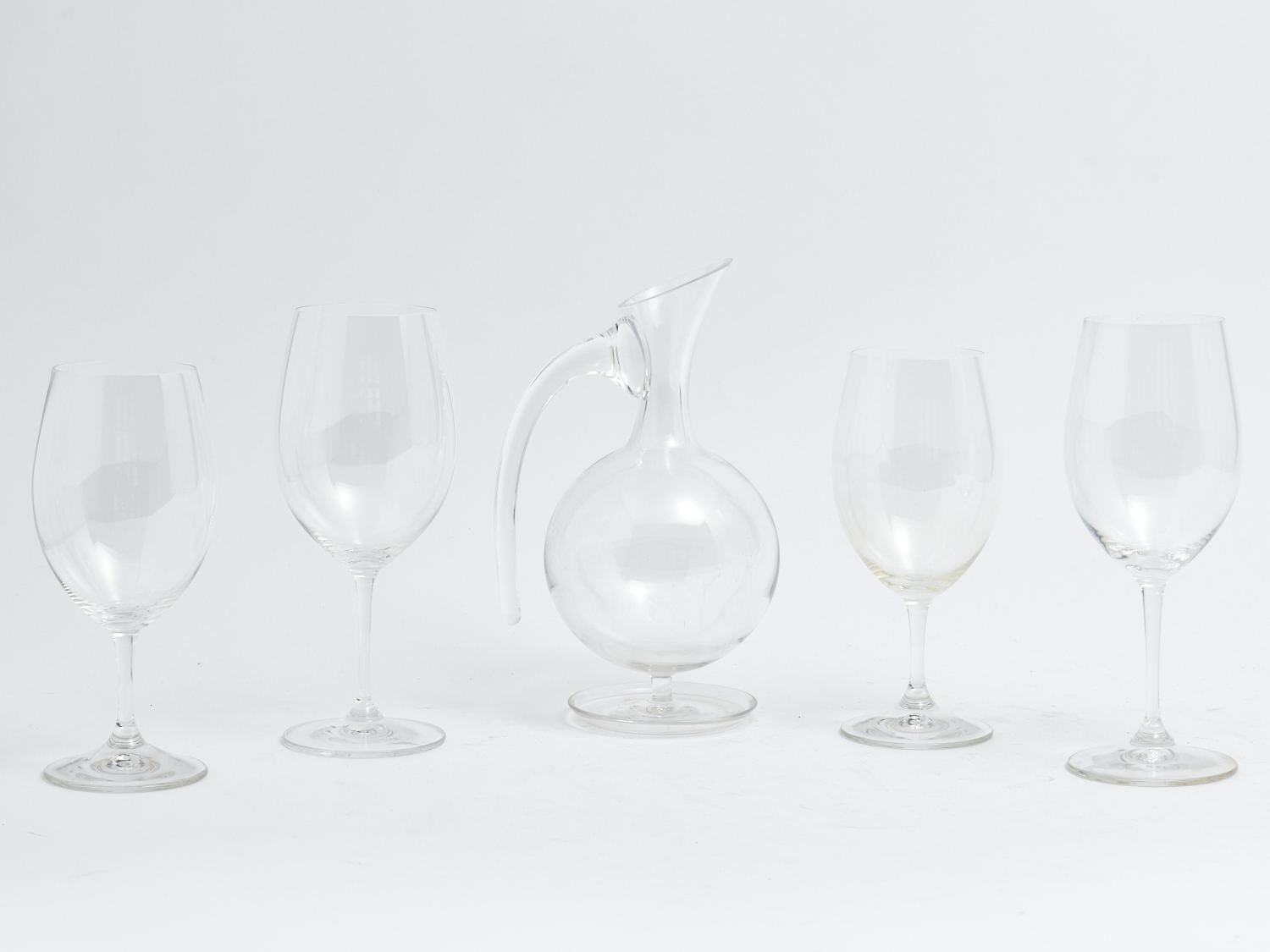 A RARE HAND BLOWN RIEDEL 'POMEROL' CRYSTAL DECANTER FOR MATURE MERLOTS TOGETHER WITH A SET OF FOUR RIEDEL MERLOT GLASSES H.25CM (DECANTER), LEONARD JOEL DELIVERY SIZE: MEDIUM
