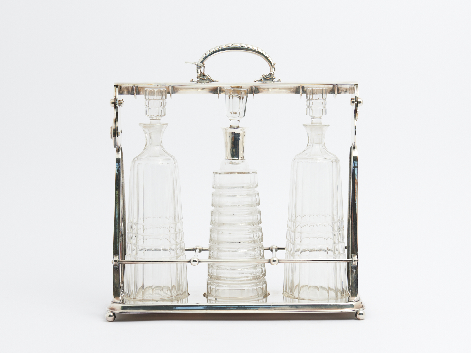 A TANTALUS OF THREE DECANTERS (WITH KEY) (A/F) H.37CM, LEONARD JOEL DELIVERY SIZE: MEDIUM