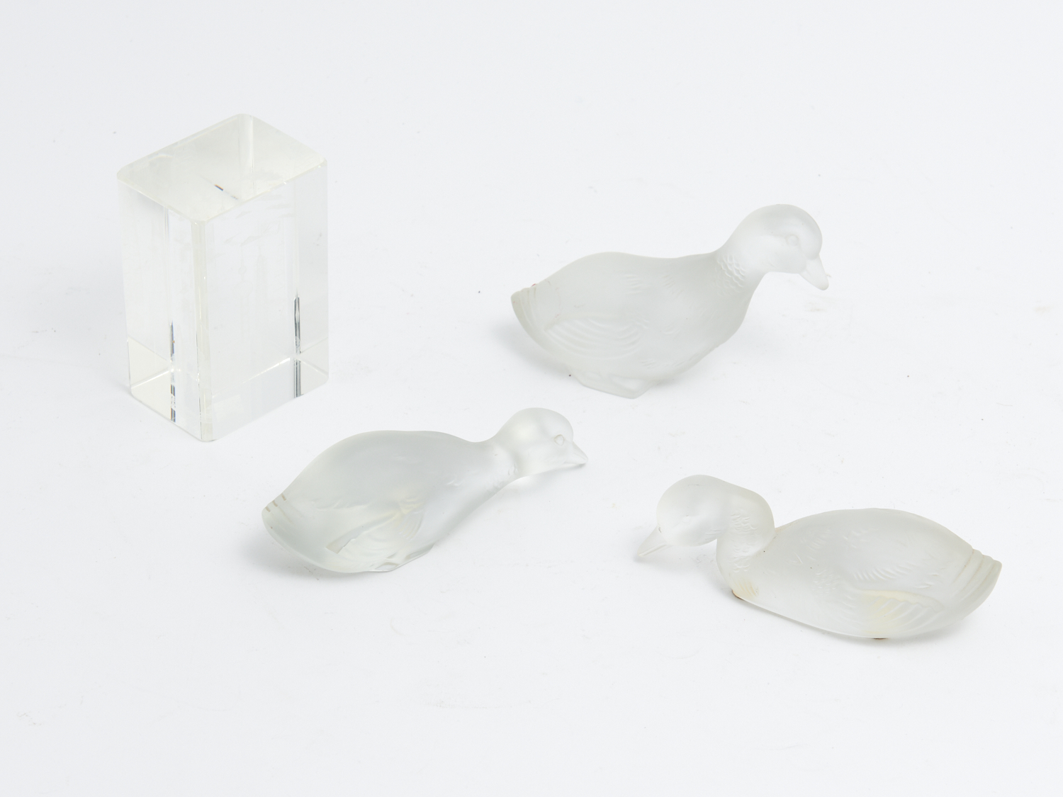 THREE BACCARAT FROSTED GLASS DUCKLINGS AND A 3D HOLOGRAM CRYSTAL SHANGHAI ORNAMENT L.13.5CM, LEONARD JOEL DELIVERY SIZE: SMALL