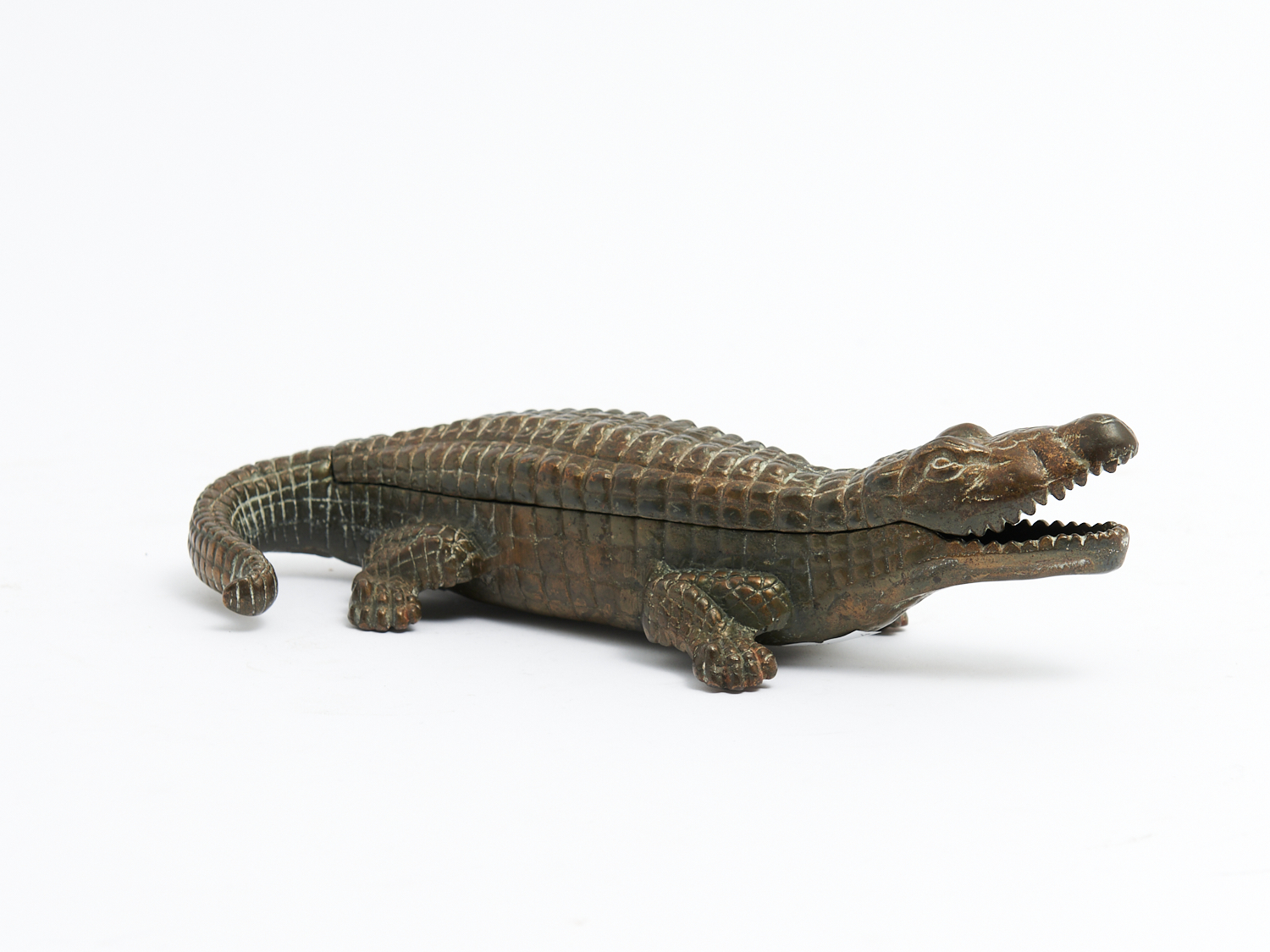 AN ANTIQUE ENGLISH BRASS CROCODILE / ALLIGATOR DESK TIDY BY UNION WITH HINGED LID AND THREE COMPARTMENTS L.25CM, LEONARD JOEL DELIVERY SIZE: SMALL