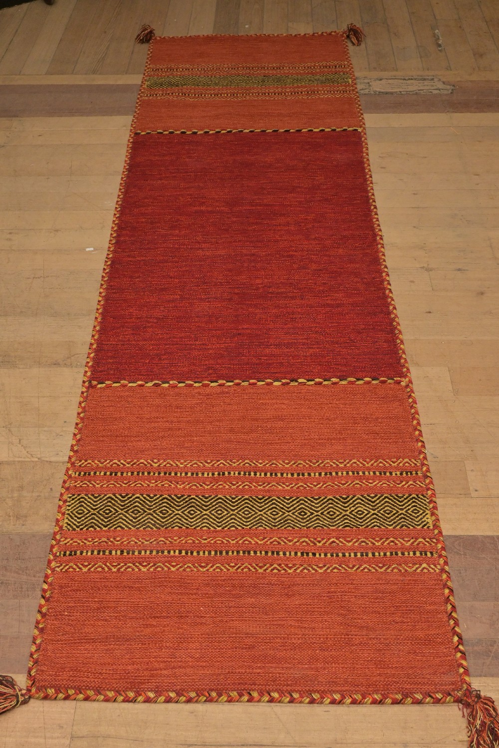 A BRAND-NEW LARGE COLOURFUL, DENSELY HAND-WOVEN RAJASTHANI KILIM RUNNER. VERY DURABLE AND SOFT TO WALK ON, REVERSABLE. MADE FROM THE FINEST COTTON FLEECE. IN RED TONES. SIZE: 300 X 80 CM-ORIGIN: JAIPUR - RRP: $700. DOCUMENTATION OF AUTHENTICITY INCLUDED