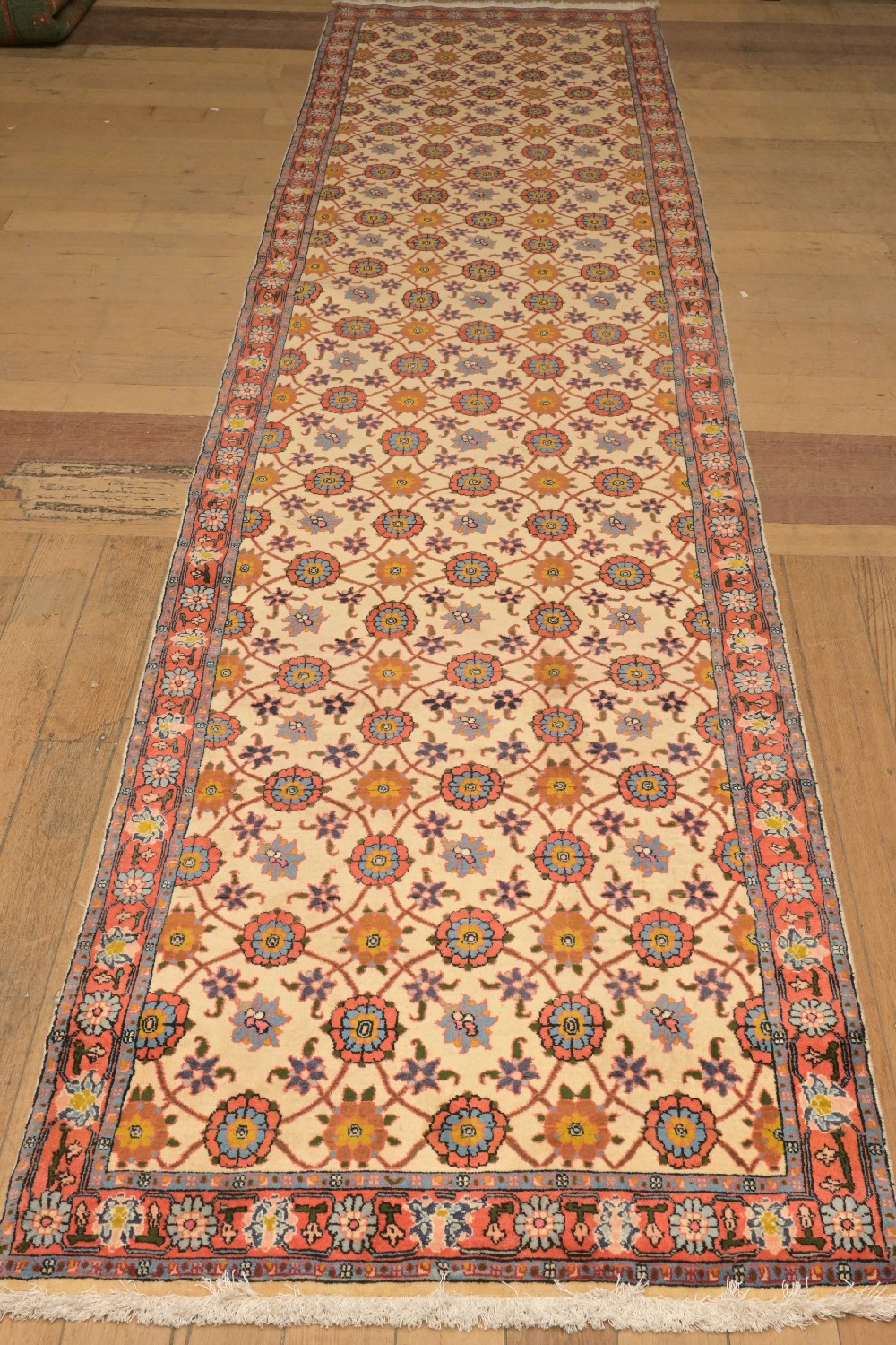 A FINE PERSIAN VARAMIN HALL RUNNER, 100% SOFT LAMBS WOOL, DENSE PILE. FINELY HAND-KNOTTED CITY WEAVE WITH ALL OVER MINA KHANI MOTIFS SET WITHIN AN IVORY FIELD. ALL OVER TONES OF CREAM, SAGE GREEN, RUST AND FRENCH BLUE. BORDER OF ROSETTES AND MINIATURE PALMETTES. SIZE: 396 X 94 CM. ORIGIN: PERSIA - RRP: $4,900. DOCUMENTATION OF AUTHENTICITY INCLUDED